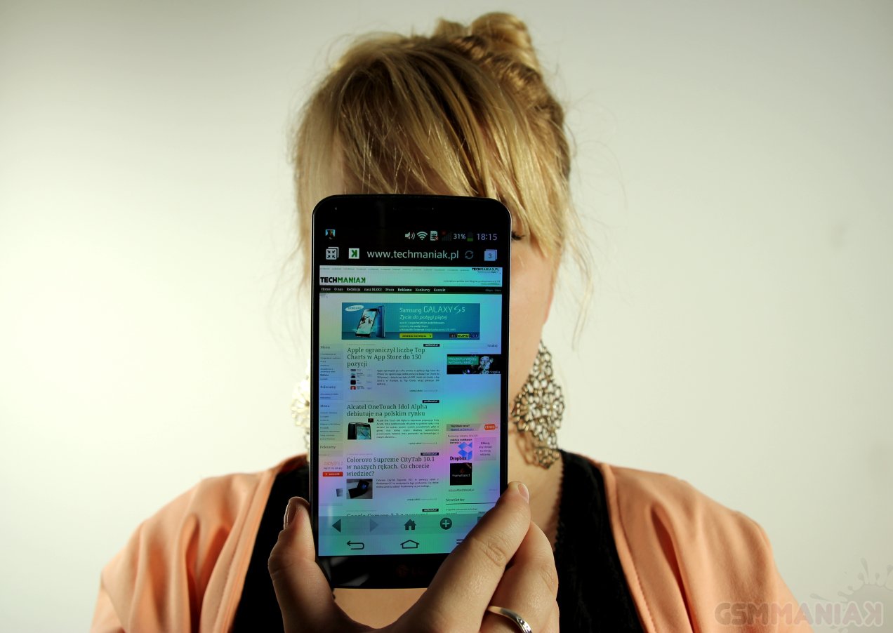 Ekran osłonięty został powłoką Gorilla Glass. Wykonanie matrycy w technologii IPS zazwyczaj skutkuje bardzo dobrymi kątami widzenia, tutaj mamy jednakże do czynienia z P-OLED – LG G Flex, także ze względu na kształt ekranu wypada nieco słabiej, niż jego „płascy” koledzy. Wyników nie można jednak nazwać złymi – wyświetlacz jest czytelny, choć kolory i podświetlenie nie są już takie idealne, jak gdy patrzymy na telefon wprost.