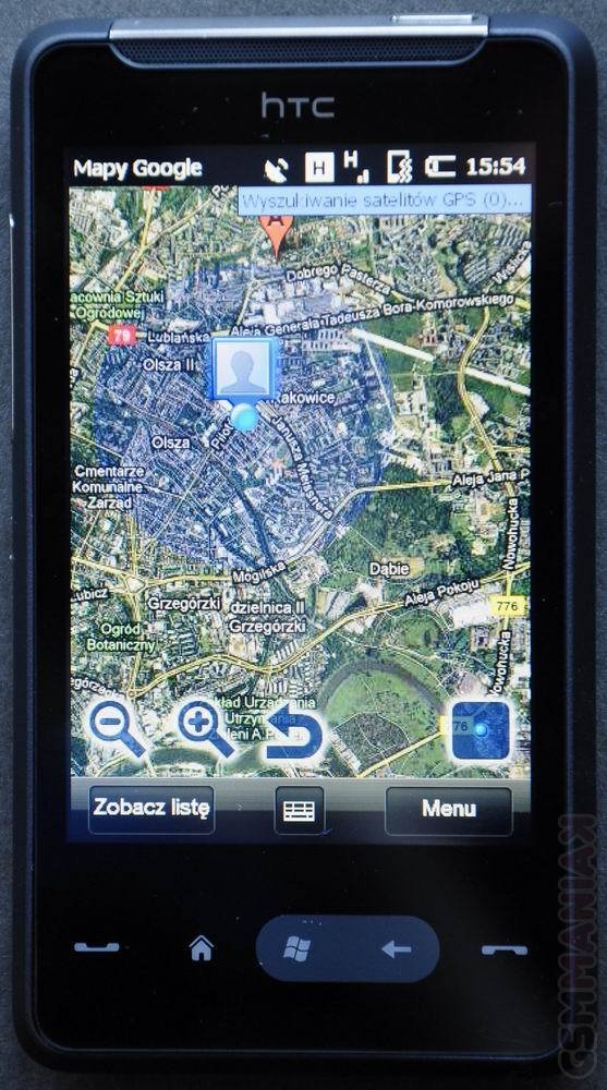 W testowanym przeze mnie smartfonie nie zabrakło również odbiornika GPS. Współpracuje on z Google Maps, jak również innymi aplikacjami nawigacyjnymi. Muszę przyznać, że określanie lokalizacji trwało dosyć długo (dobre kilkadziesiąt sekund), a efekt nie był zadowalający. Dokładność wynosząca 3000m to zdecydowanie kiepski wynik. Wiele z testowanych przeze mnie telefonów radziło sobie bez porównania lepiej. Samych map nie ma sensu specjalnie komentować, gdyż praktycznie to samo znajdziecie w wersji PCtowej.