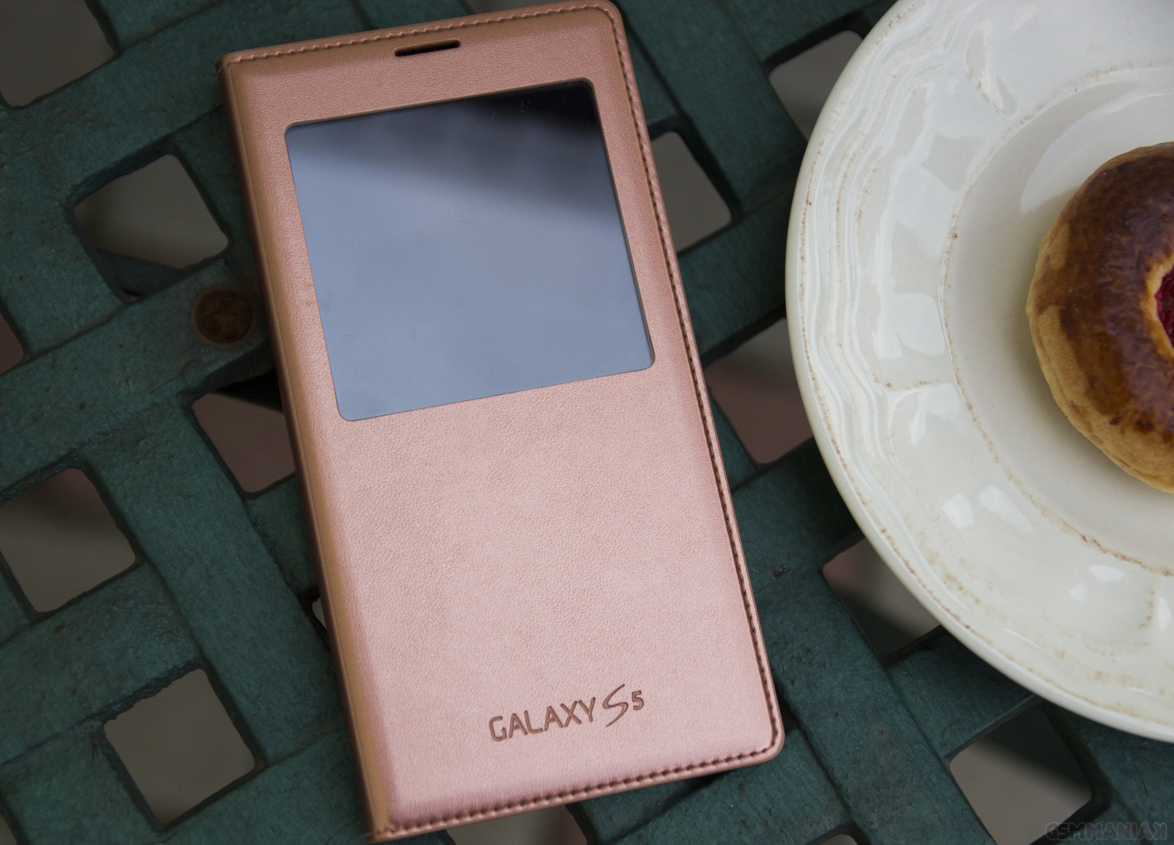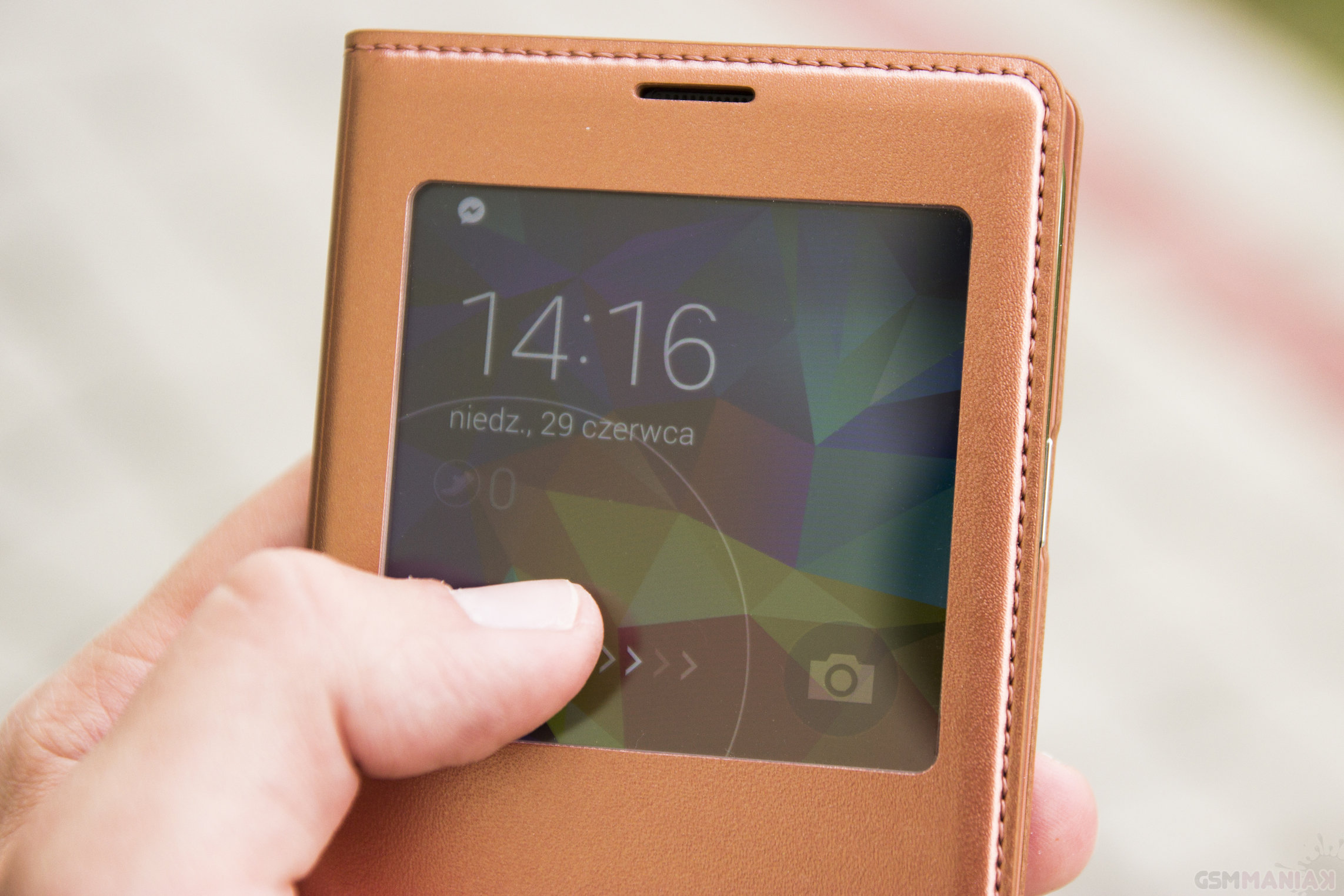 Najdroższym z serii futerałów dla Galaxy S5 jest etui S-View posiadające niemalże bliźniaczą budowę do Flip Covera. Różnica polega na tym, że tutaj dodano okienko umożliwiające wykonanie prostych czynności na telefonie bez potrzeby otwierania etui. Wykonamy szybko zdjęcie, otrzymamy dostęp do godziny, pogody i podglądu zdarzeń, np. nieodebranych połączeń głosowych. Można także wyświetlić ilość przebytych kroków mierzonych przez aplikację S-Health.