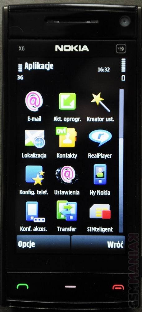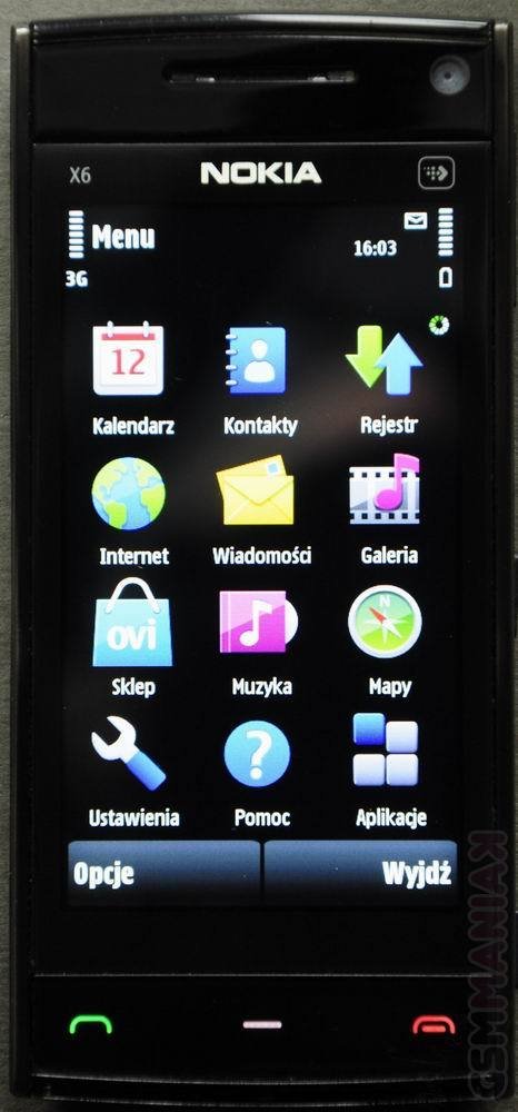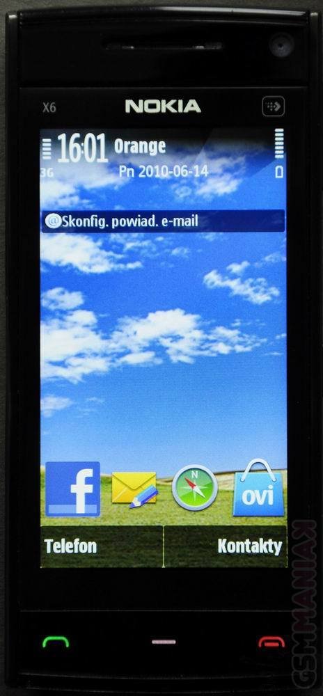 Interfejs S60 piątej edycji znajdziecie w większości dotykowców Nokii. Co za tym idzie – nowości i rewelacji w X6 niema. Ekran główny wygląda typowo: skróty do kontaktów, telefonu, najważniejszych aplikacji (możemy je zmienić i dostosować do własnych upodobań), pasek z powiadomieniami, a nad nim ulubione kontakty. Bezpośrednio nad wyświetlaczem (mówiąc z jeszcze większą dokładnością – nad kreskami oznaczającymi stan baterii) znajduje się dotykowy przycisk, który rozwija niewielkie menu. Dzięki niemu szybko dostaniemy się do najważniejszych miejsc w telefonie.