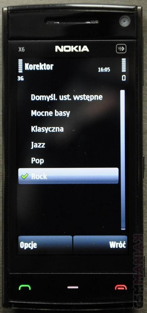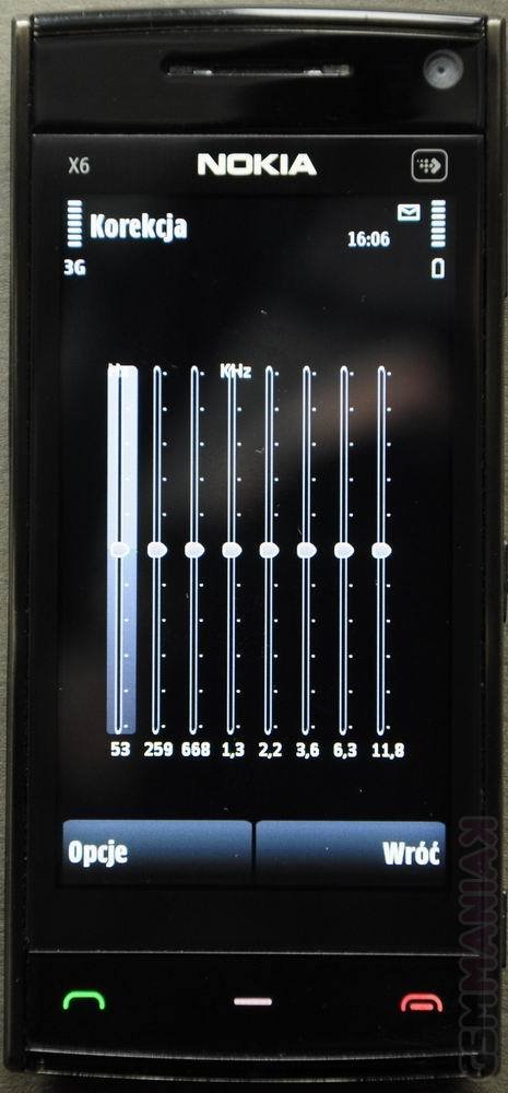 Mam tutaj na myśli liczne modyfikacje brzmienia. Pierwsza opcja to gotowe schematy: mocne basy, rock, klasyczna itd. Druga opcja, szczególnie interesująca, to obecność equalizera. Wszystko to pozwala jeszcze bardziej dopieścić i tak bardzo dobrą jakość dźwięku. Według mnie jest to chyba największa zaleta Nokii X6. Wyższej klasy dokanałowe słuchawki pozwalają cieszyć się muzyką o naprawdę świetnym brzmieniu.