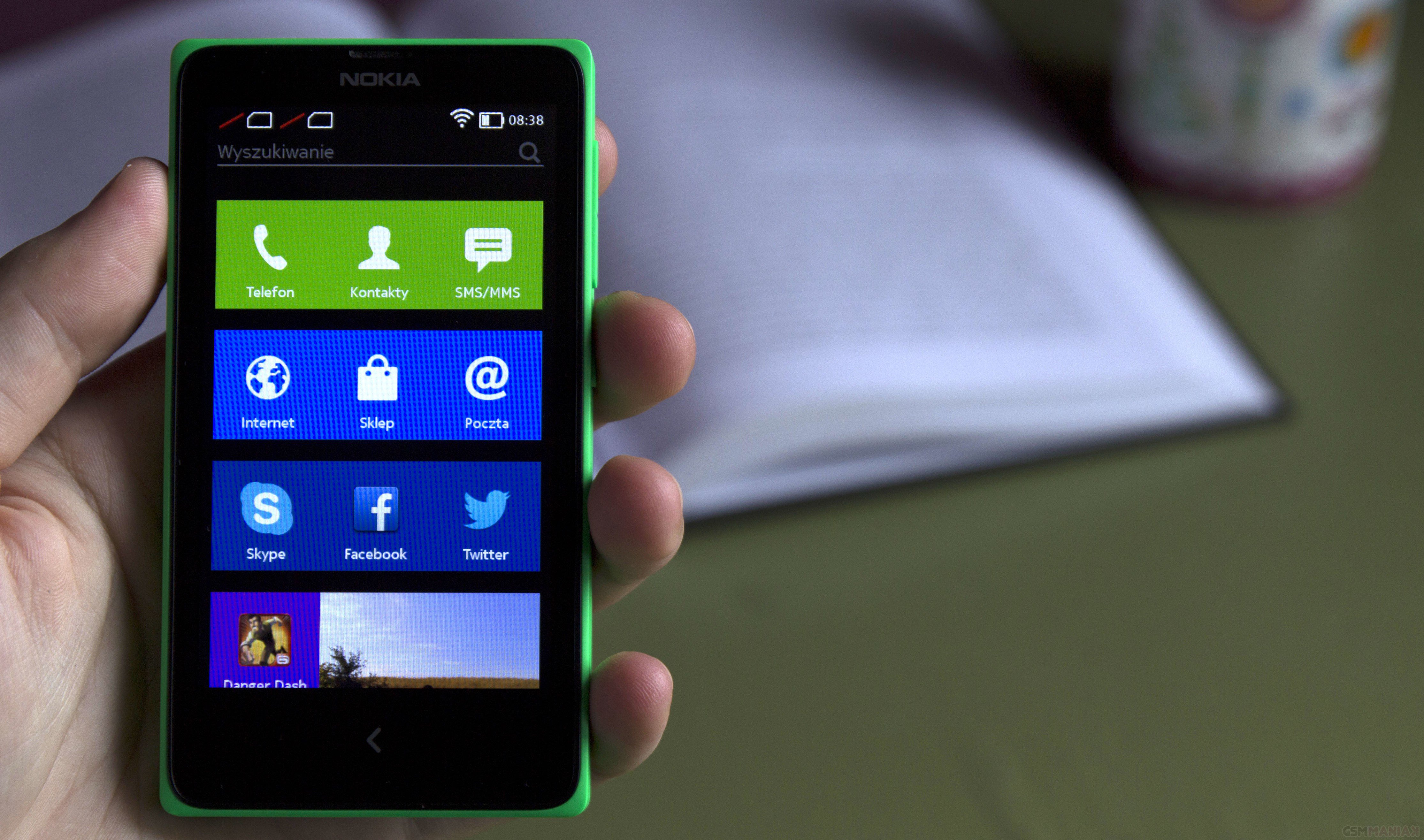 Telefon działa pod kontrolą systemu Android w wersji 4.1.2 który został przeprojektowany przez Nokię i nazwany Nokia X Software Platform. Rzeczywiście, zmiany są na tyle duże, że gdyby nie powiedziano otwarcie że to Android, mało kto mógłby się zorientować. Zmieniono niemal wszystko, co widoczne dla użytkownika. Interfejs jest podobny do tego z Windows Phone ale dopasowany funkcjonalnie do możliwości systemu Google. Mamy tutaj ekran główny z kafelkami, które możemy dowolnie sortować i skalować oraz zakładkę Fastlane z dostępem do wszystkich wykonywanych ostatnio czynności. W górnej części ekranu znajduje się wysuwany pasek powiadomień i szybkich ustawień a dodatkowe menu rozwijane jest poprzez przesunięcie w górę od dolnej krawędzi.