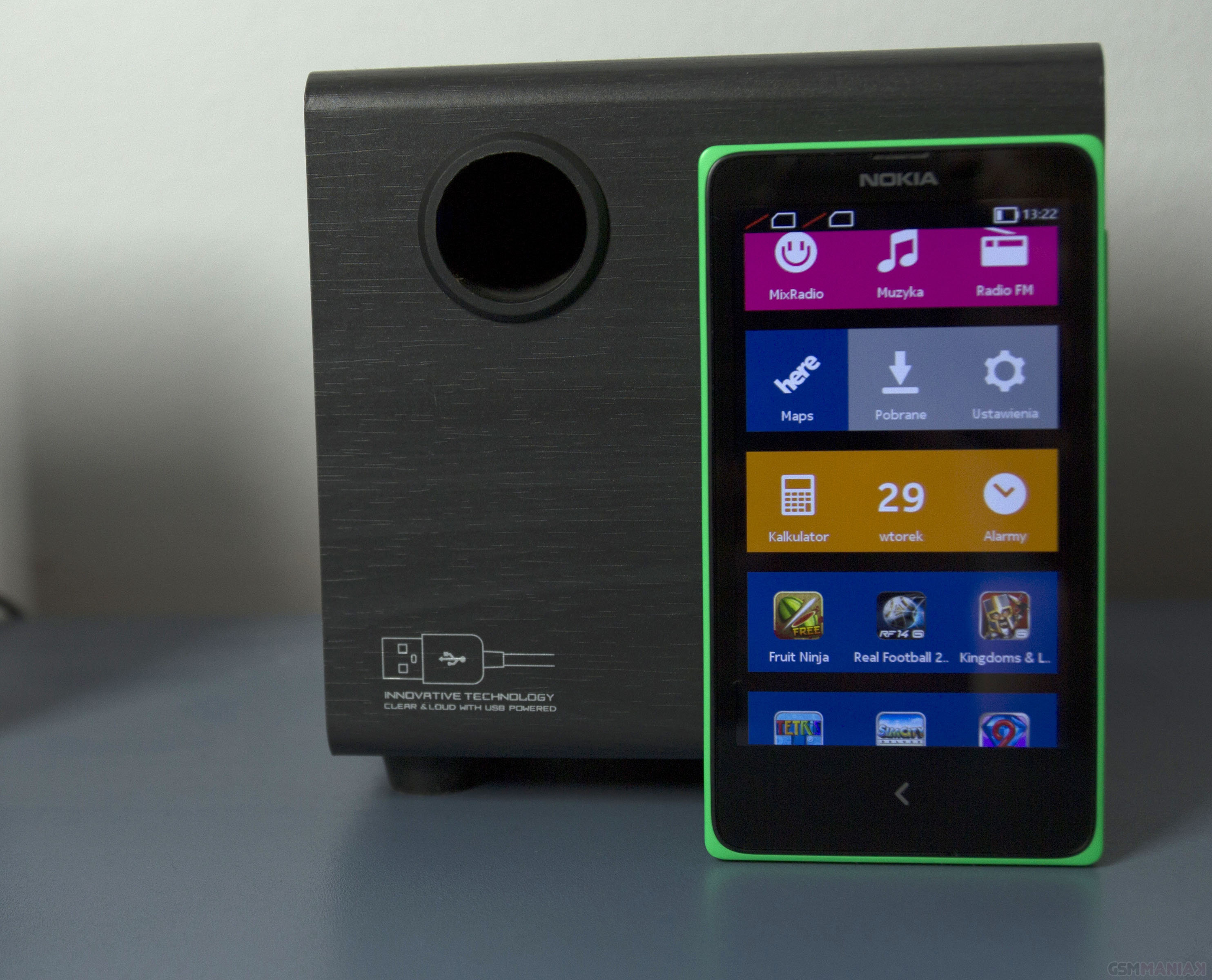Niestety, Nokia X podobnie jak pozostałe modele tego producenta nie obsługuje USB OTG. Telefon jest wyposażony w całkiem niezły, pojedynczy głośnik znajdujący się na tylnej części obudowy. Jego maksymalna głośność wynosi 87 dB a dźwięk który się z niego wydobywa pozostaje czysty nawet na maksymalnych ustawieniach.