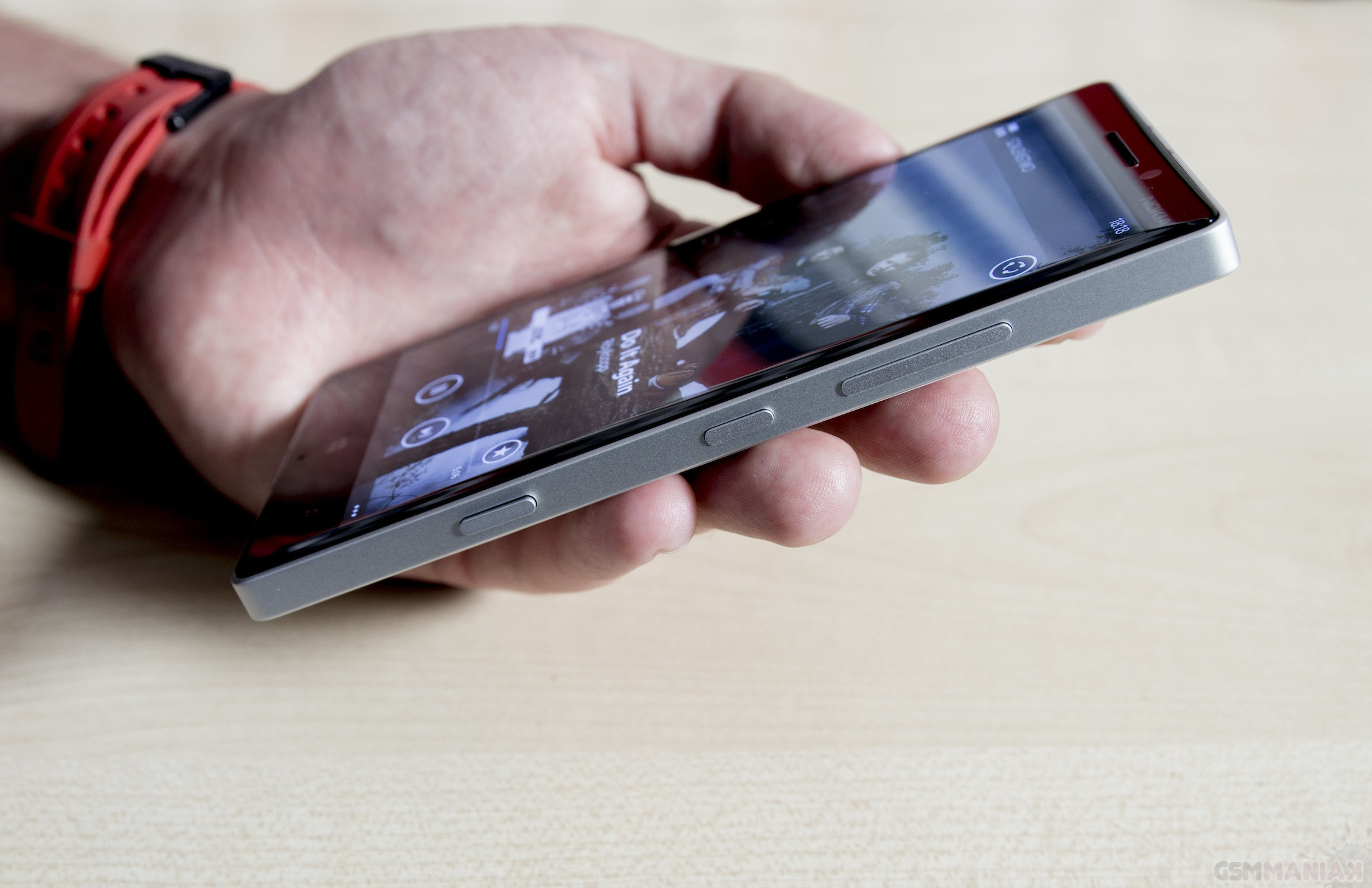 Pod ekranem znajdziemy klawisze dotykowe z własnym podświetleniem. Pod przyciskiem domowym wywiercono mały otwór, w którym mieści się mikrofon. To trochę nietypowe rozwiązanie, ale estetyka urządzenia pozostała niezaburzona. Jak wcześniej już wspomniałem, ramkę biegnącą wokół bryły wykonano z aluminium. Element ten rozdzielają plastikowe paski umieszczone na dole i na górze urządzenia, których obecność została wymuszona przez moduły łączności. Na prawej krawędzi umieszczono trzy guziki fizyczne: dwufunkcyjny do budzenia i usypiania telefonu, przycisk regulacji głośności oraz fizyczny spust migawki. Ten ostatni nie posiada tak dobrego skoku, jak rozwiązanie z Lumii 1520 i trzeba się przyzwyczaić do jego działania. Te trzy elementy nie pasują mi do całości. Wydaje mi się, że producent potraktował je po macoszemu. Delikatnie się chwieją, a przy tym nie zostały precyzyjnie osadzone w korpusie urządzenia.