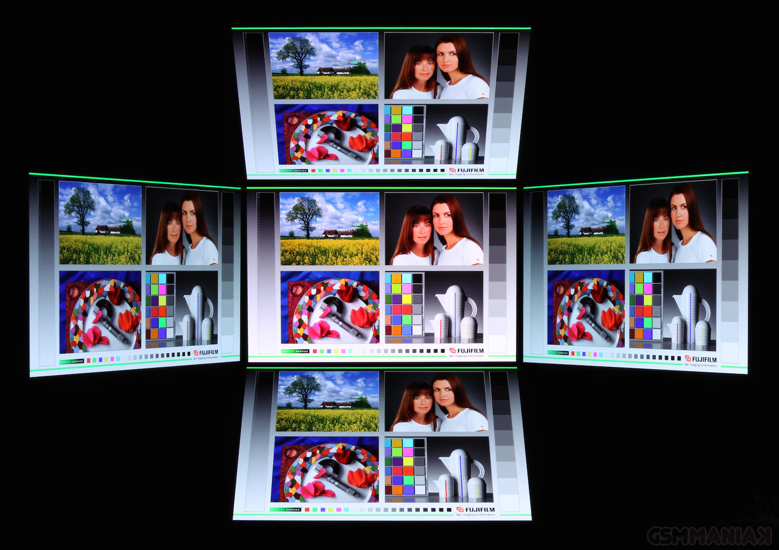 Telefon wyposażono w ekran o przekątnej 5 cali, pracujący w rozdzielczości 1080p. Przy takiej przekątnej otrzymujemy współczynnik zagęszczenia równy 441 ppi, a to nieznacznie więcej, niż w przypadku Sony Xperii Z2 czy Samsunga Galaxy S5, gdzie obraz w tej samej rozdzielczości wyświetlany jest na 5,2-calowym wyświetlaczu. Możemy zatem liczyć na bardzo ostre czcionki o idealnie wygładzonych krawędziach oraz bardzo dobrą czytelność stron internetowych w widoku komputerowym. Duże zagęszczenie pikseli przedkłada się także na większą szczegółowość wyświetlanych zdjęć czy filmów. Zamontowana matryca OLED charakteryzuje się wzorową reprodukcją kolorów, co łatwo zauważyć w teście kątów widzenia – wyszedł niemal bezbłędnie.