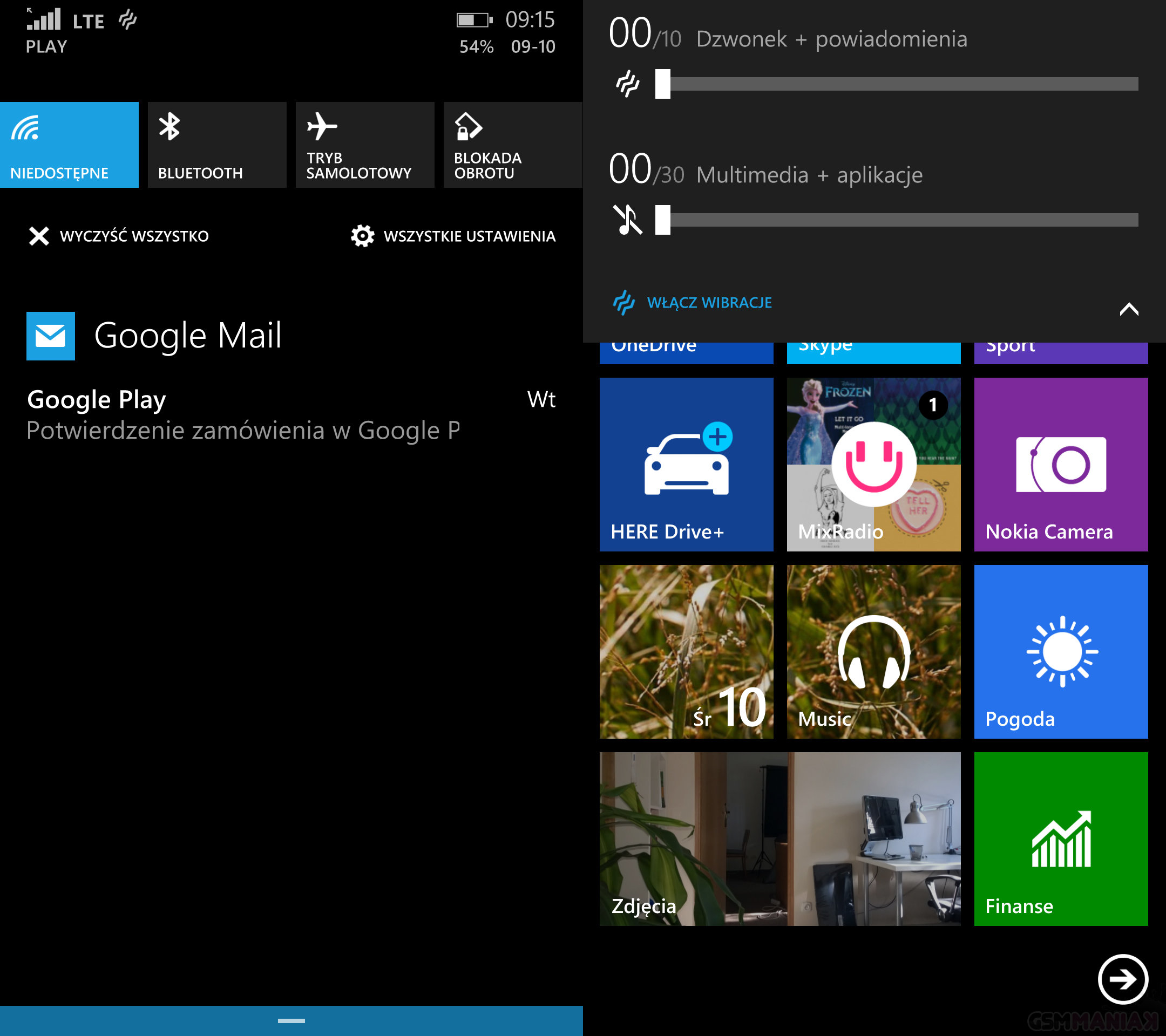 Lumia 930 pracuje pod kontrolą systemu Windows Phone 8.1 – wersji, która przynosi kilka ciekawych i potrzebnych zmian do środowiska kafelków. Najczęściej wspominaną opcją jest oczywiście pasek powiadomień, który gromadzi wszystkie zdarzenia, takie jak notyfikacje o przychodzących wiadomościach, nadchodzących wydarzeniach itp. Wprowadzenie tego rozwiązania było wręcz konieczne, ponieważ w wersji 8.0 wszystkie powiadomienia wyświetlane były w formie banerów, które nierzadko zajmowały górny obszar ekranu przez kilka minut, zwłaszcza, kiedy pojawiła się duża ilość wiadomości w Facebookowym komunikatorze.