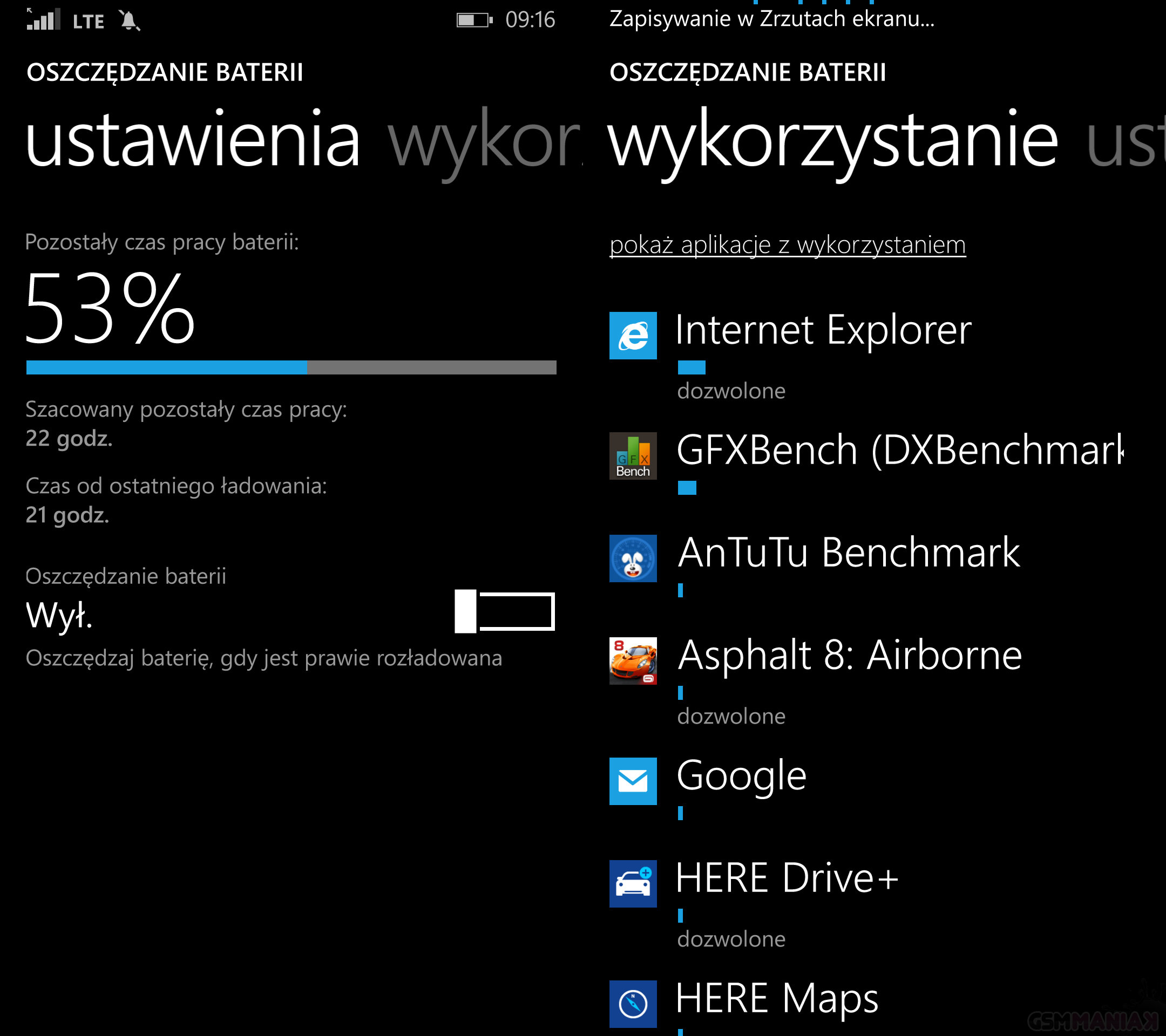 Microsoft zadbał o podanie użytkownikowi kompletu informacji dotyczącego użycia telefonu, w tym stworzono rozbudowany analizator wykorzystania energii baterii. Oprócz danych na temat procentowego stanu naładowania akumulatora z szacunkowym czasem jego wyładowania, możemy teraz podejrzeć, które z aplikacji silnie zaangażowały się w wykorzystanie mocy ogniwa. Twórcy systemu zadbali także o kieszenie użytkowników implementując rozbudowany czujnik danych, który stara się, aby wykorzystanie naszego pakietu danych zostało zminimalizowane.