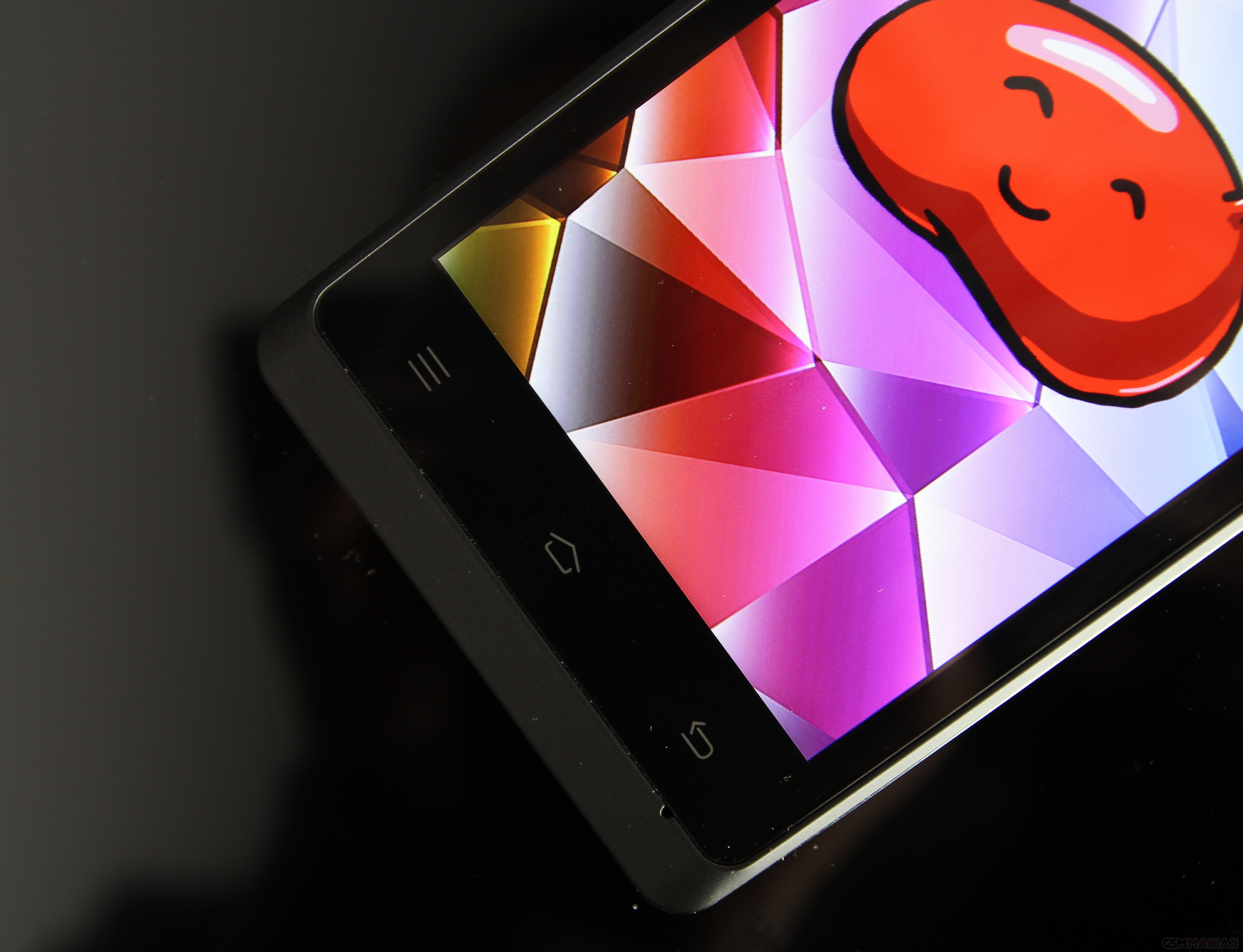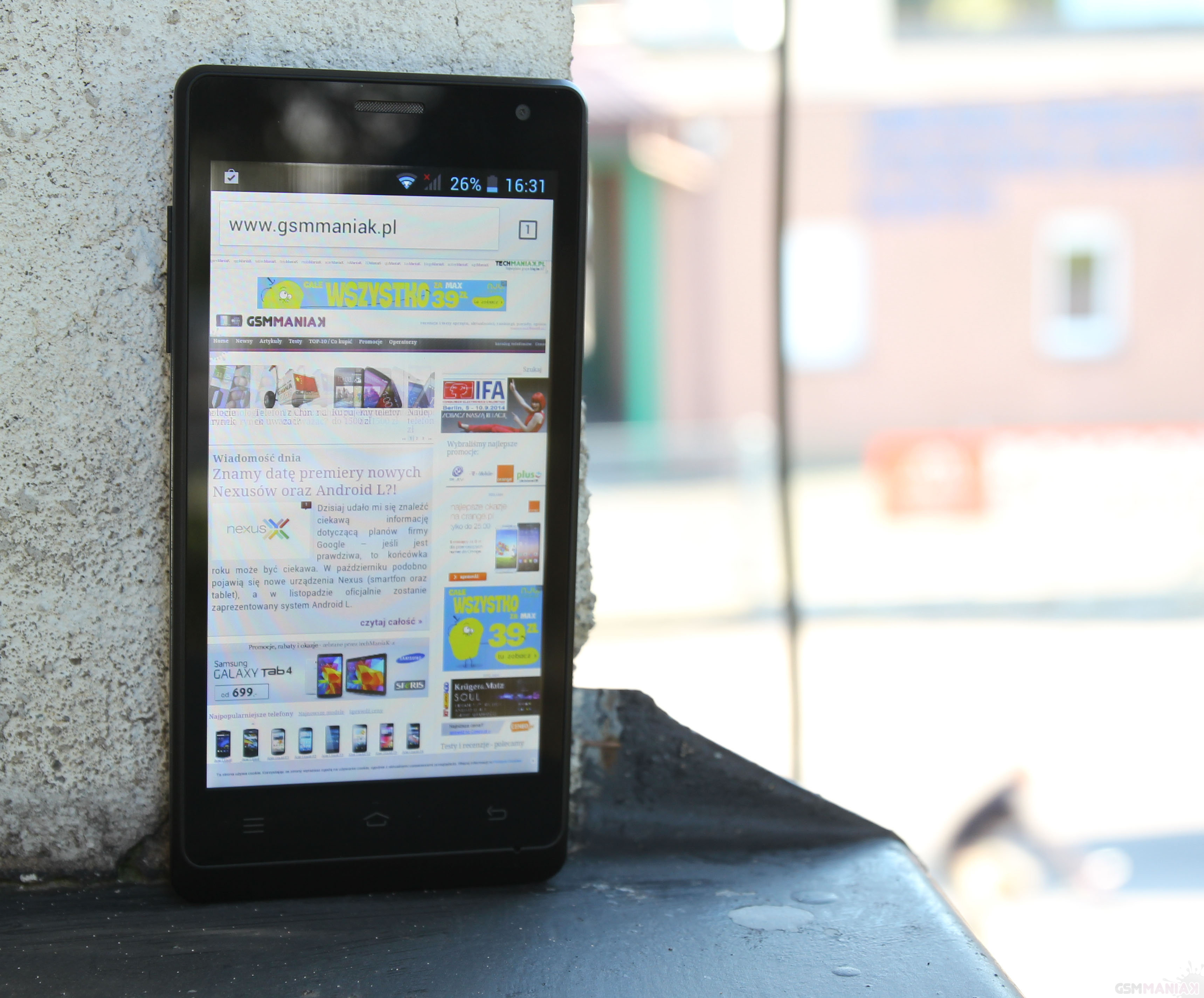 Telefon bazuje na 4,5-calowym wyświetlaczu TN o rozdzielczości 480 x 854 pikseli. Jest to przeciętna jednostka, która zadowoli jedynie mało wymagających użytkowników. Prezentowane kolory są akceptowalnej jakości, jednak nic ponad to. Słabe nasycenie barw zauważymy, gdy będziemy mieli możliwość bezpośredniego porównania panelu z innym, lepszym ekranem IPS, AMOLED czy nawet TN z wyższej półki. Niestety, zawodzą również kąty widzenia, które są charakterystyczne dla wykorzystanej technologii – degradacja kolorów (blaknięcie barw, efekt negatywu) następuje głównie przy odchyleniach w pionie.
