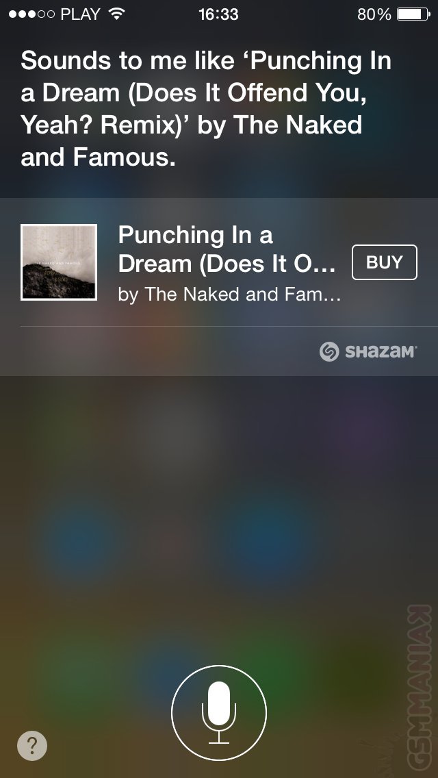 Hey Siri to nie wszystko, w co zaopatrzono asystenta głosowego iOS-a. Apple zintegrował go z popularną usługą Shazam. Dzięki temu, jeżeli chcesz się dowiedzieć jak nazywa się odtwarzany utwór, wywołaj Siri i poproś ją o jego zidentyfikowane. Wówczas trzeba będzie pozwolić systemowi na zarejestrowanie krótkiej próbki dźwięku, po czym Siri, jeżeli pomyślnie rozpozna utwór, wyświetli jego nazwę, wykonawcę oraz album.