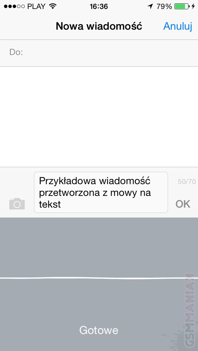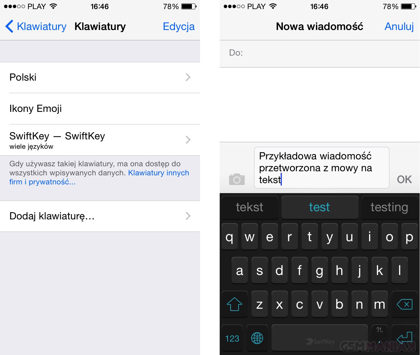 Jeżeli chodzi o iOS-a 8, to Apple wprowadził również system przetwarzania mowy na tekst, który bez problemu obsługuje język polski. Aktywuj w systemowych ustawieniach (w zakładce Siri) funkcję dyktowania tekstu, a następnie, korzystając z przycisku-mikrofonu obok spacji na klawiaturze, otwórz mechanizm przetwarzania mowy – system w czasie rzeczywistym będzie przetwarzał zidentyfikowane komunikaty i wprowadzi je w zaznaczonym polu tekstowym. Gdy skończysz, aby funkcja dalej nie nasłuchiwała, naciśnij Gotowe.