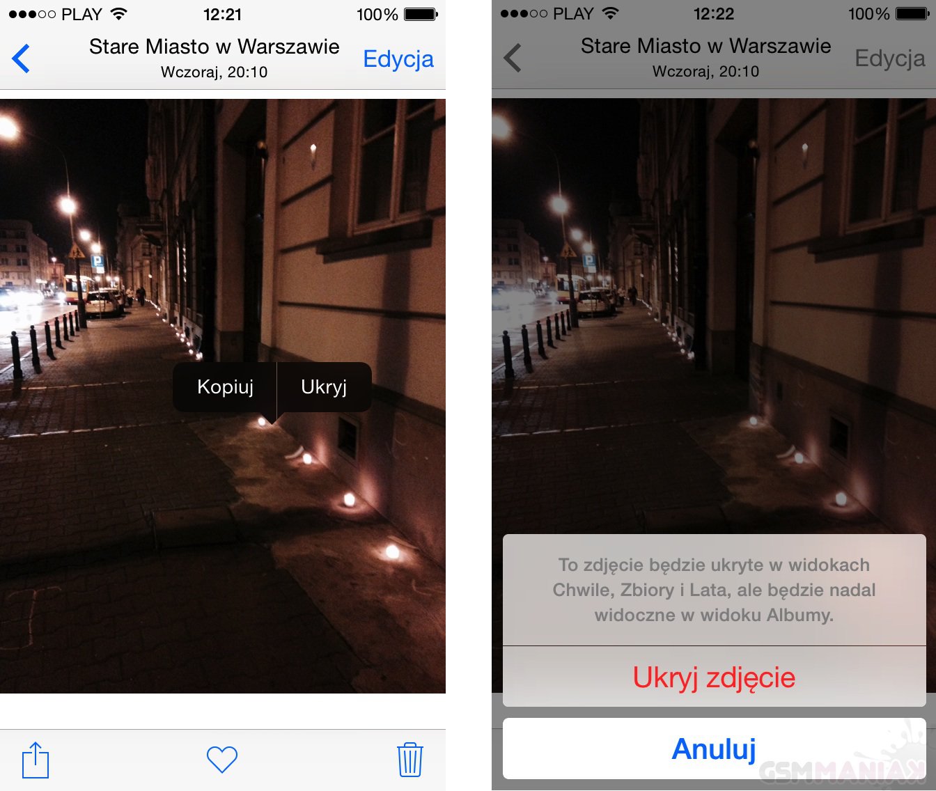 iOS 8 pozwala w pewien sposób ukryć zdjęcia i wideo, co również sprawa, że nie są one synchronizowane przez aplikacje firm trzecich z zewnętrznymi usługami. Chcąc ukryć zdjęcie lub wideo, naciśnij i przytrzymaj na nim palec, a następnie wybierz opcję Ukryj. O ile zniknie ono z zakładki Zdjęcia, o tyle wciąż będzie widoczne w zakładce Albumy.