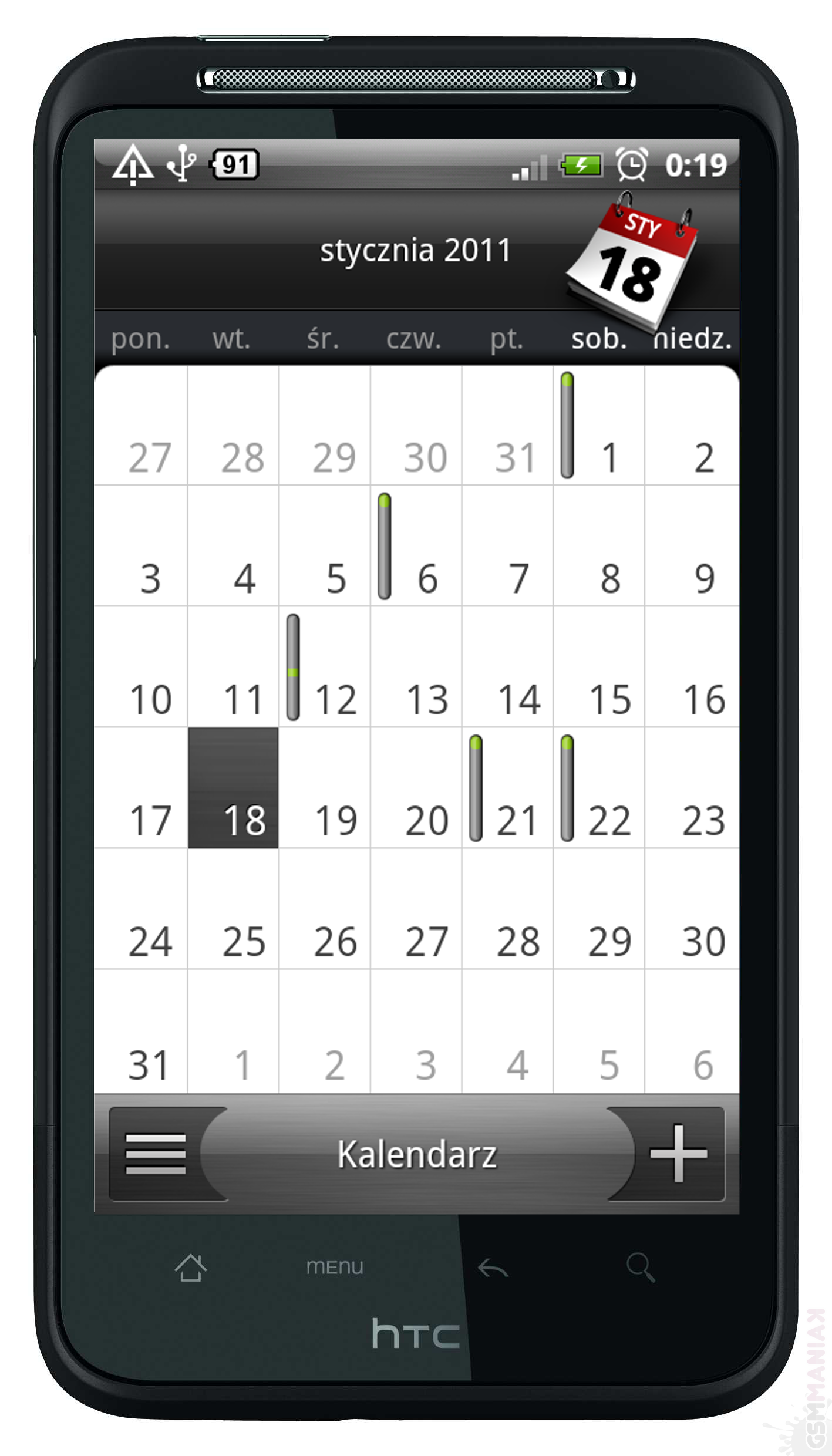 Kalendarz mamy jeden, ale widgety dwa, standardowy Androida i HTC. Sama aplikacja, podobnie jak lista kontaktów, integruje się ze skrzynką mailową Gmail (która tutaj stanowi w zasadzie trzon działania) oraz portalami społecznościowymi. Dodatkowo możemy ją synchronizować z komputerem. Dodając wydarzenie, możemy dodać jego lokalizację, a nawet wpisać adresy e-mail gości, którzy zostaną o nim poinformowani. Program potrafi również wyświetlać pobrane z Internetu lokalne święta.