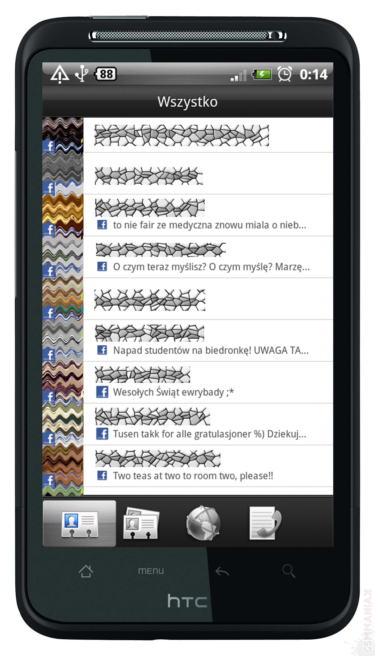 Lista kontaktów we współczesnych smartfonach jest już w zasadzie multiplatformowa. Nie inaczej jest tutaj. Nasza ”książka telefoniczna” jest tak naprawdę niesamowicie rozbudowaną bazą kontaktów, która dane czerpie z karty SIM, Facebooka, Twittera, Flickra, konta Gmail oraz samej pamięci telefonu. Wszystko stanowi bardzo spójną całość, w której nawigowanie wbrew początkowym pozorom jest bardzo proste i przyjemne. Większych problemów nie powinna też sprawiać opcja łączenia kontaktów z różnych źródeł.