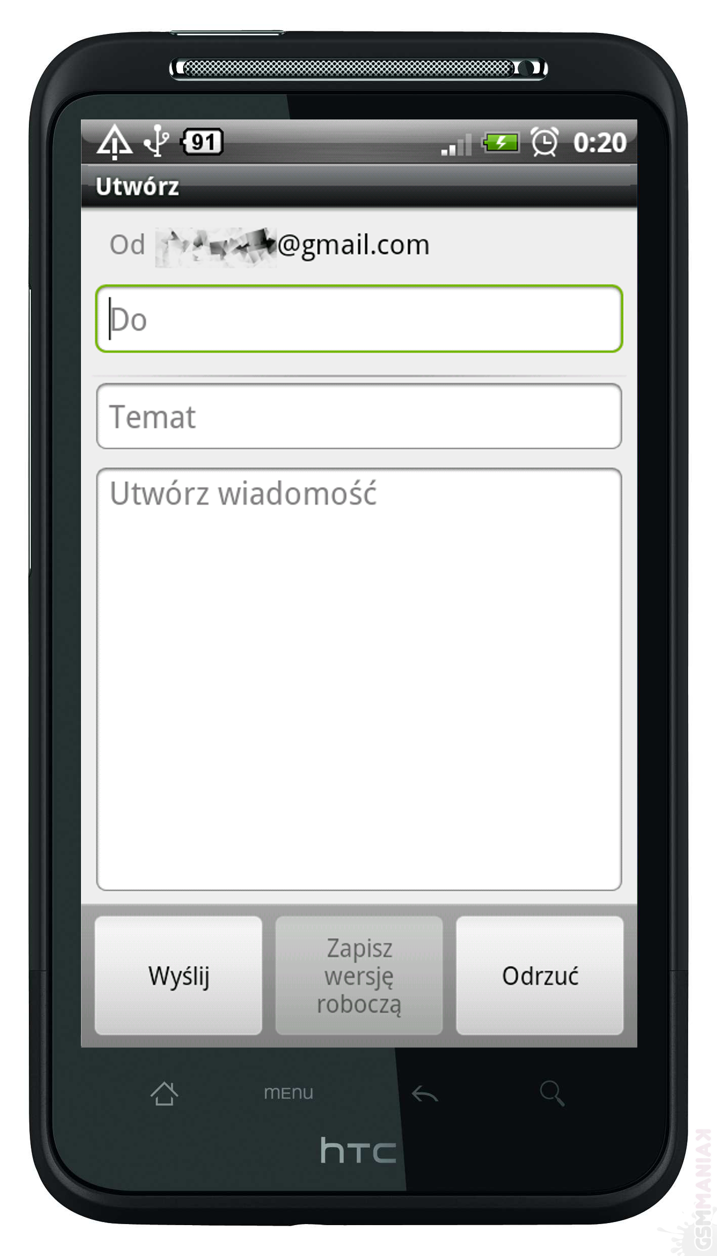 HTC Desire HD jest wyposażony w dwie aplikacje pocztowe. Pierwsza z nich, Gmail, obsługuje konta działające właśnie w tym serwisie. Listy będące sekwencją odpowiedzi są grupowane w jedną całość, coś na styl okna czatowego, naprawdę ciekawa rzecz. Skrzynka jest w pełni zintegrowana z wersją przeglądarkową i nie zachodzą sytuacje, w których przeczytana na pececie wiadomość, tutaj jest oznaczona jako ta, do której jeszcze nie zajrzeliśmy.