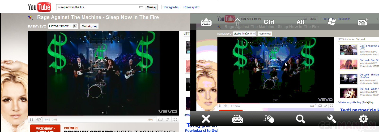 Dane z komputera przesyłane są w czasie rzeczywistym do telefonu – obraz możemy dowolnie przybliżać/oddalać, a pojedynczym dotknięciem ekranu wywołać pojedyncze kliknięcie myszą. Poniżej znajduje się również dodatkowy panel, ułatwiający manewrowanie po naszym pulpicie. Pierwszy przycisk kończy sesję, drugi wywołuje klawiaturę, trzeci spełnia zadanie prawego przycisku myszy. Następne dwa to lupka do przybliżania obrazu (przydatne w wypadku modeli nieobsługujących multi-touch) oraz menu działań. Dzięki niemu możemy włączyć menedżer urządzeń, a także zablokować lub zresetować komputer. Ostatni przycisk prowadzi do ustawień, takich samych jak w oknie głównym aplikacji.