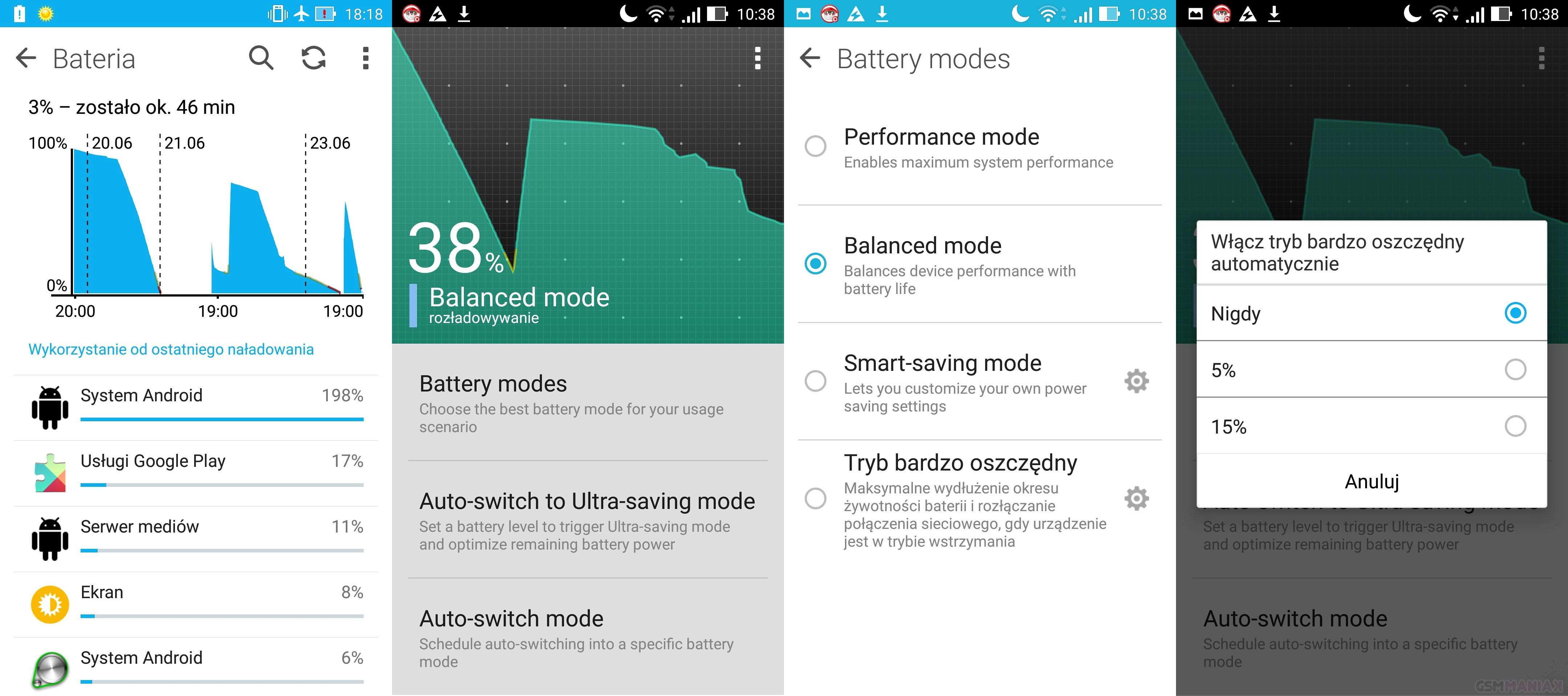 ASUS pozwala nam też na skorzystanie z rozmaitych trybów oszczędzania energii – od umiarkowanego po ekstremalny. Istnieje również możliwość programowania zachowania telefonu i uruchamiania wspomnianych planów w określonych okolicznościach.