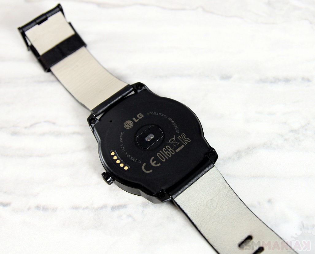 Wbrew pozorom, LG G Watch R nie został wykonany w całości z metalu – spód, będący jednocześnie zaślepką baterii (przykręcona śrubkami), został wykonany z tworzywa sztucznego dobrej jakości. Pomyśleć by można, że plastikowy element w tak eleganckim urządzeniu będzie strzałem w stopę, jednak w mojej opinii chropowate tworzywo jest bardziej przyjazne dla skóry, niż metalowa płytka. Na spodzie zegarka projektanci umieścili styki niezbędne do uzupełniania energii oraz pulsometr.