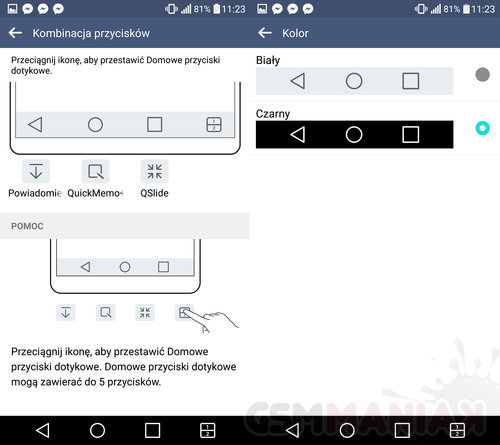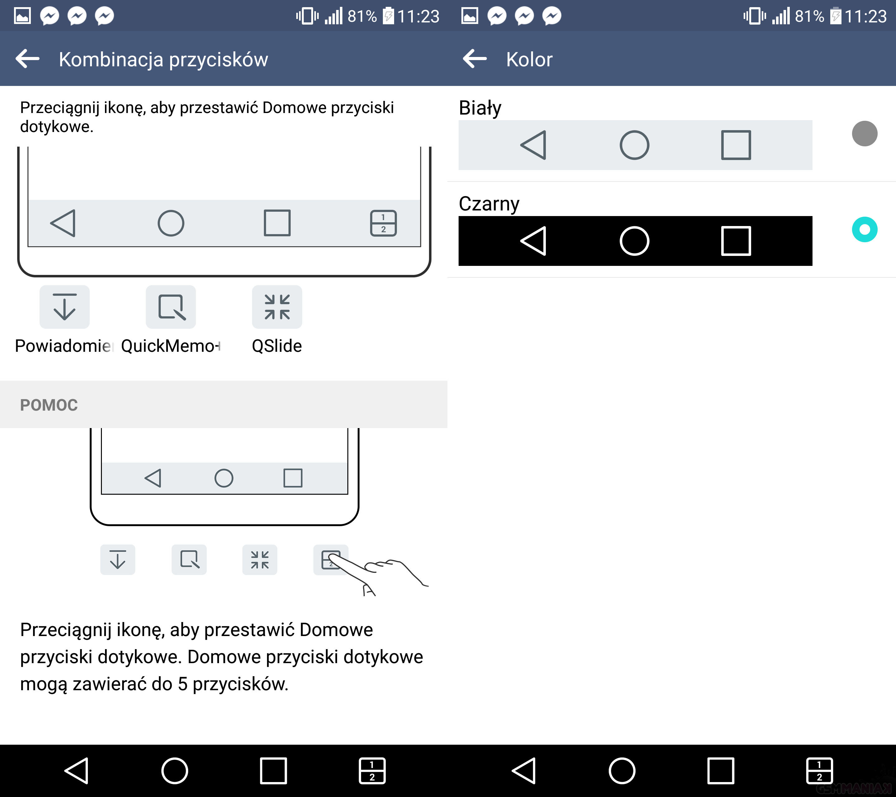 Również dolna belka z guzikami obsługi systemu daje się spersonalizować według naszych potrzeb — możemy zmienić jej kolor i dostawić kilka ikon (maks. 5). W ten sposób, oprócz klawisza powrotu, domowego i do przywołania ostatnio używanych aplikacji, możemy też dostawić skrót wielu okien, QSlide, QucikMemo+ lub skrót przywołania belki powiadomień.