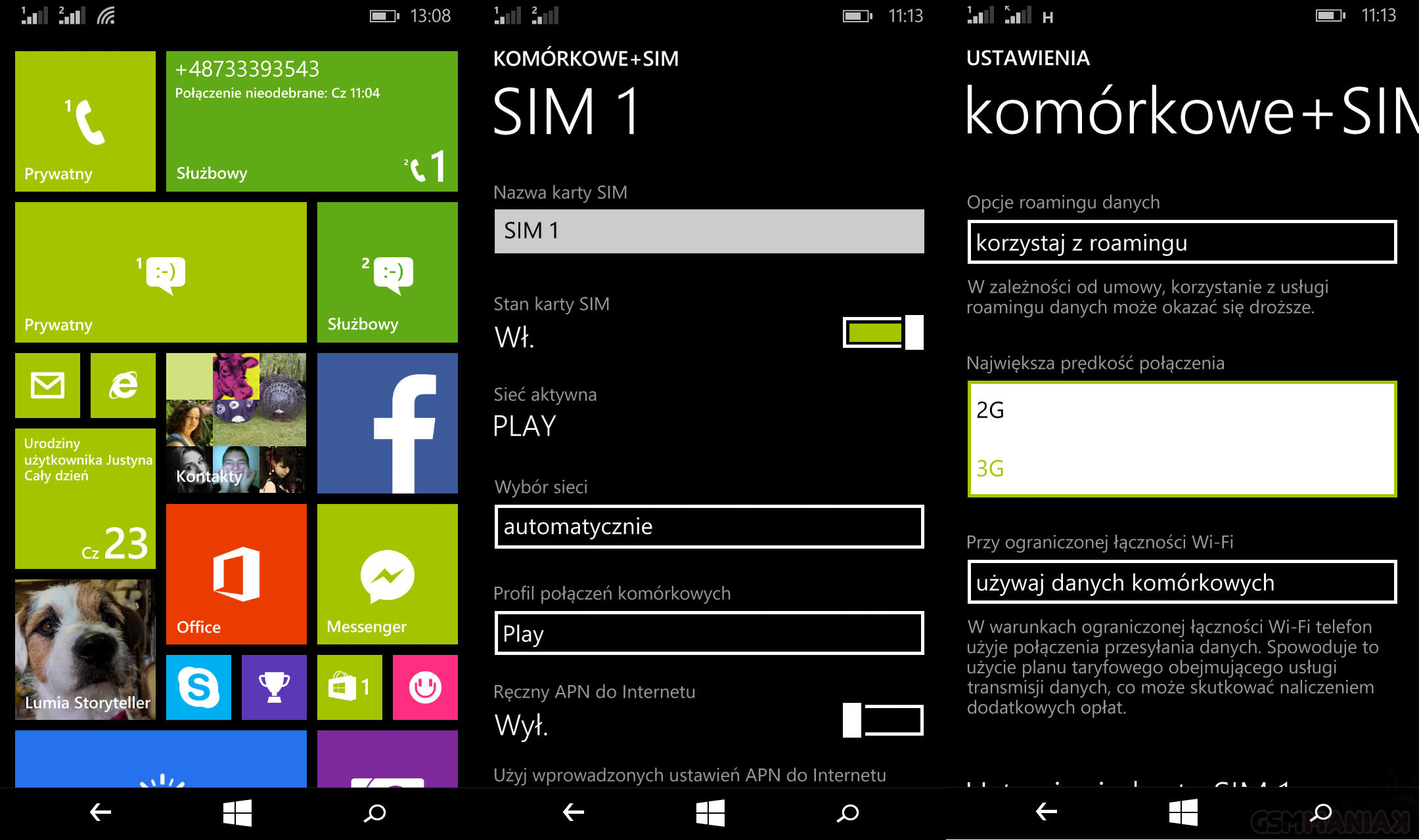 W ustawieniach możemy wybrać, która karta będzie służyć do transmisji danych oraz narzucić maksymalną szybkość połączenia (oba sloty oferują sieć 3G, nie zabrakło wsparcia dla Aero2).