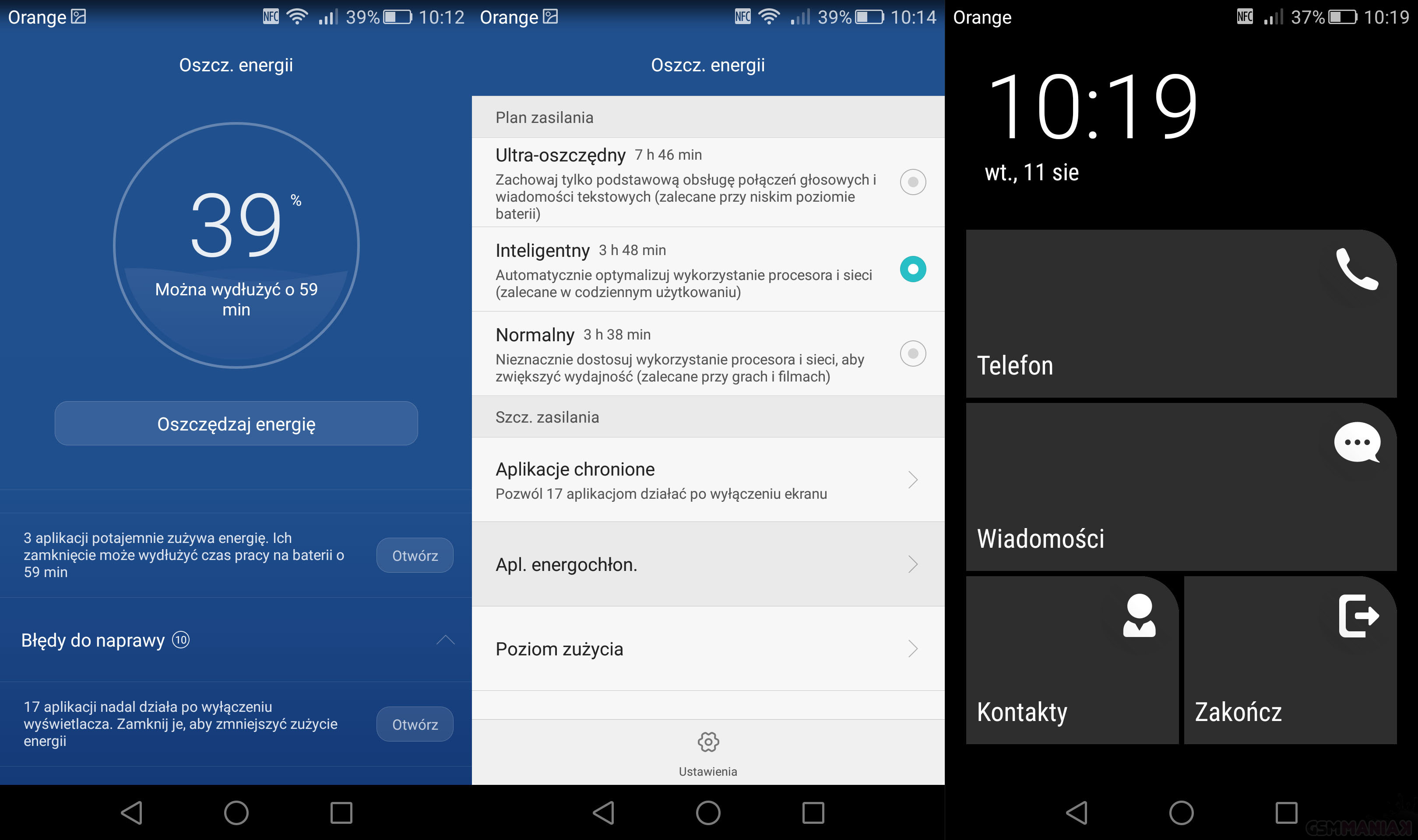 Przypadła mi do gustu aplikacja analizująca zużycie energii akumulatora. Kiedy surfowałem po Internecie, telefon powiadomił mnie o programach zużywających znacząco czerpiących baterię w tle — w tym przypadku o przeglądarce i komunikatorze. Zainstalowany menadżer zasilania prowadzi spis programów, które mają za duży apetyt na energię, a oprócz tego możemy wybrać jeden z trzech dostępnych profilów energetycznych: