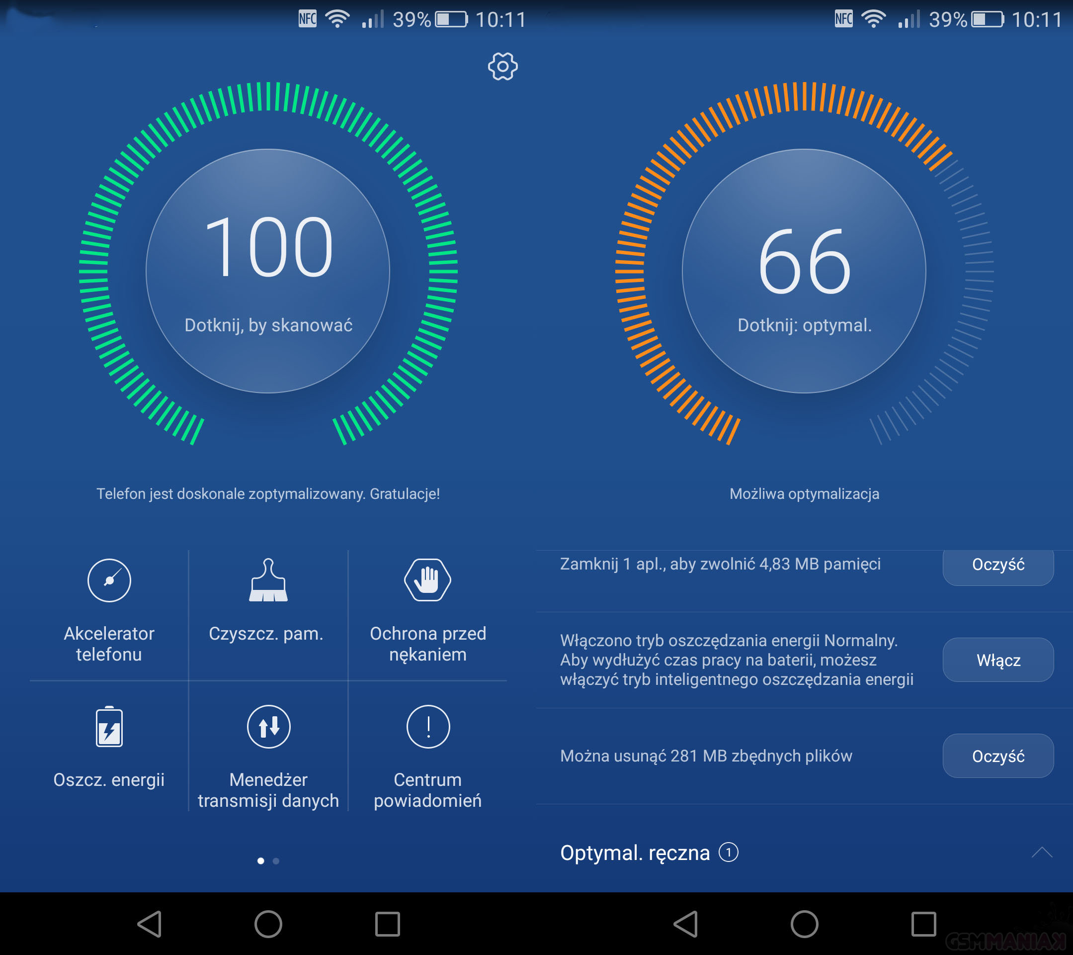 Spośród aplikacji dodanych chciałbym wyróżnić jedną — menadżera telefonu, który pozwoli oczyścić pamięć podręczną, zoptymalizować działanie systemu i podejrzeć zużycie danych pakietowych. Z tego właśnie miejsca zablokujemy dostęp aplikacji do internetu oraz uruchomimy tryb oszczędzania energii.