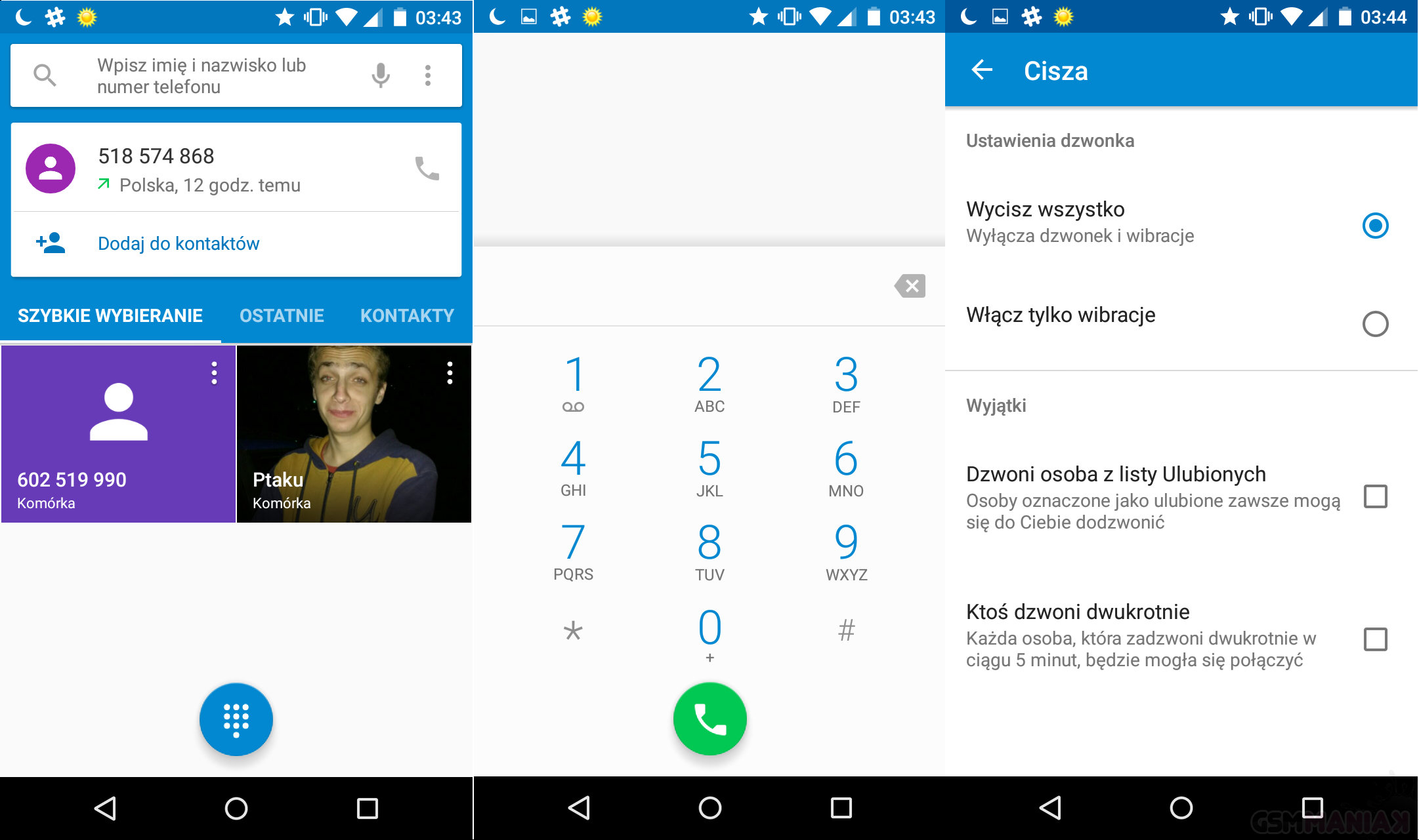 Aplikacja dialera jest praktycznie nie tknięta, zatem każdy powinien się w niej odnaleźć bez problemu. Telefon posiada ciekawy tryb „sen” który o określonej godzinie wyłącza ekran i powiadomienia głosowe – oczywiście możemy ustalić kontakty które są wyjątkami aby nie przegapić czegoś na prawdę ważnego.