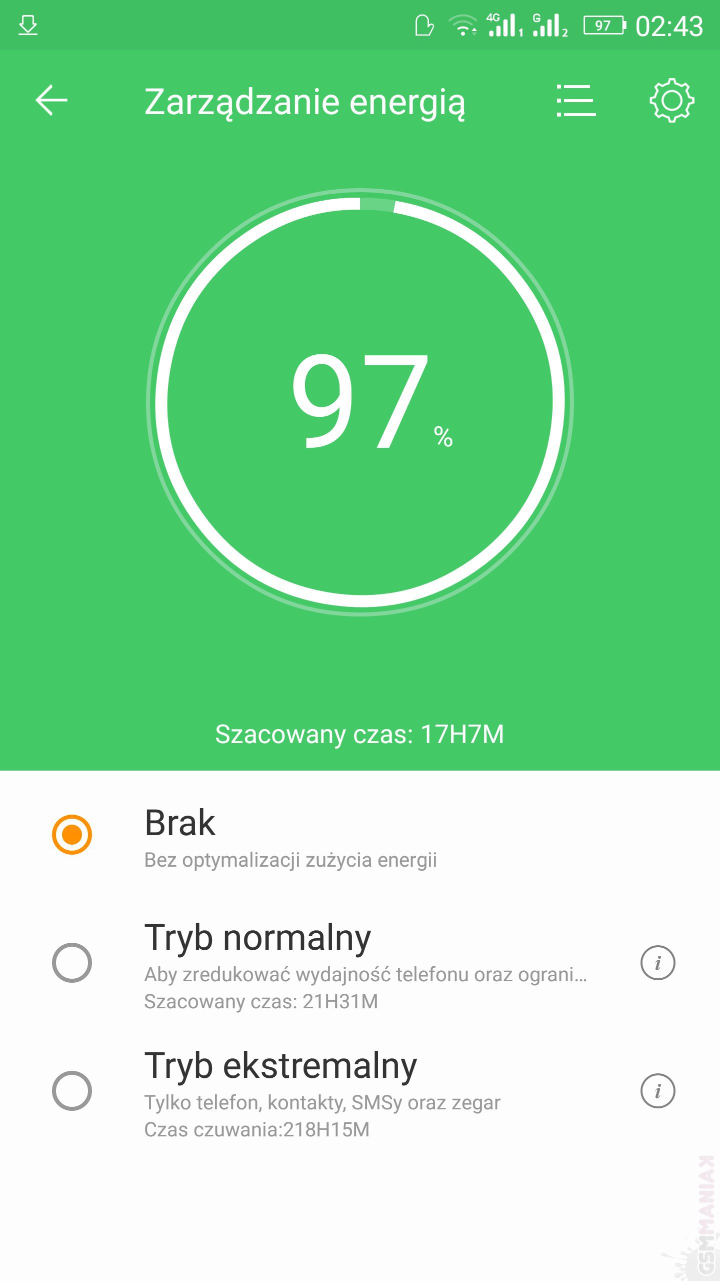 W normalnym użyciu, telefon wytrzymuje do 2 dni bez ładowania i nie jest to okupione mocno zredukowaną jasnością ekranu czy dezaktywacją sieci 4G. Po wprowadzeniu oszczędniejszych ustawień i powstrzymaniu się od niepotrzebnych aktywności czas ten można wydłużyć nawet do 3 lub 4 dni. Z drugiej strony, przechodząc kilka misji w Modern Combat 5 z włączonym LTE i muzyką w tle, można bez problemu rozładować smartfon w ciągu 4 lub 5 godzin. W ustawieniach znajdziemy co prawda tryb ekstremalnego oszczędzania energii, jednak on praktycznie bezużyteczny ze względu na wyskakujący co chwilę błąd.