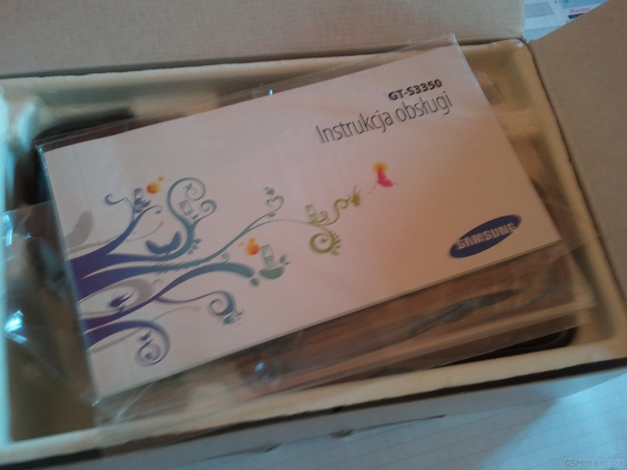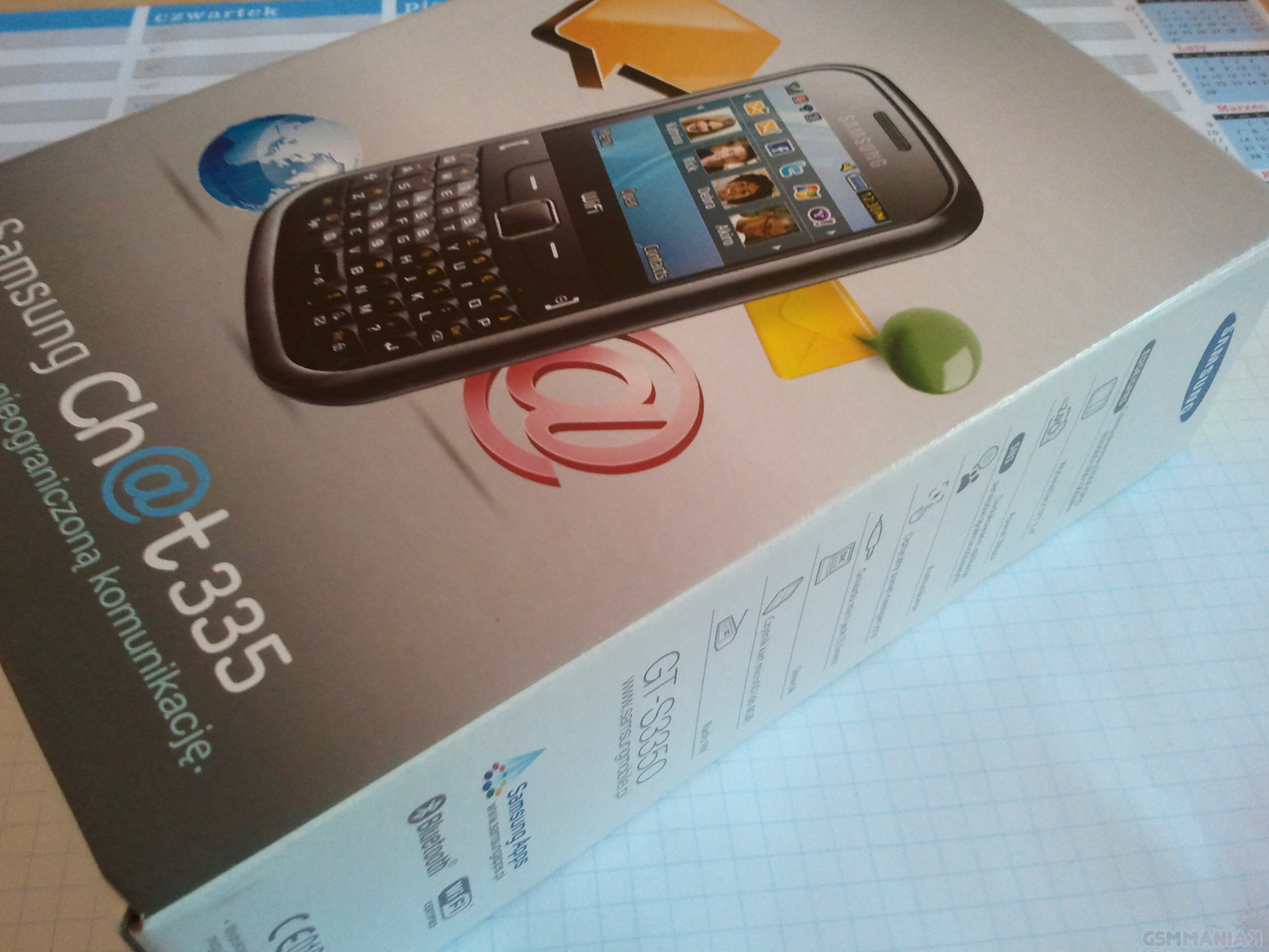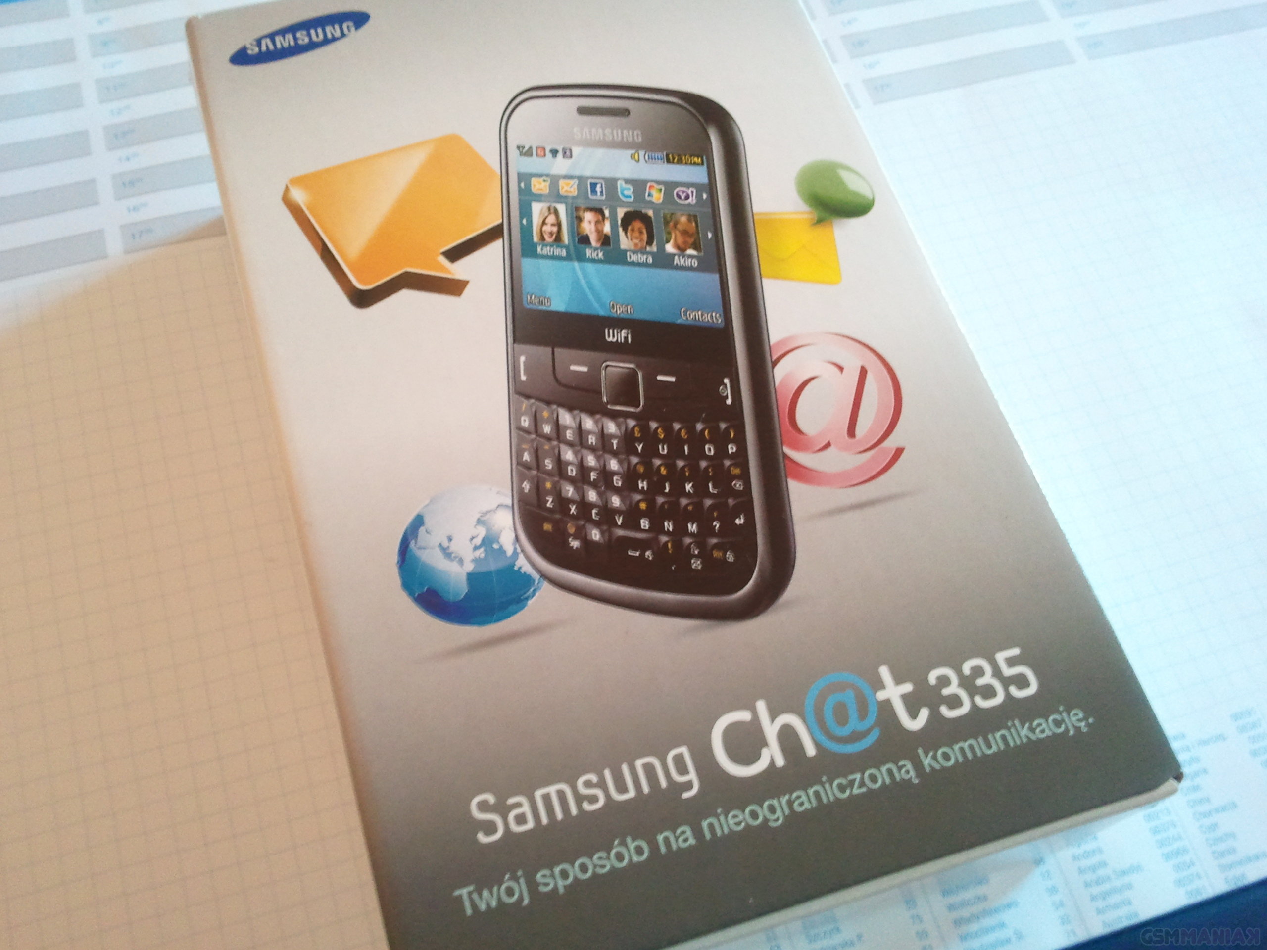 Ch@t 335 dostał od producenta ładnie wyglądające pudełko „z polską lokalizacją”: główna ściana pudełka wita nas pozytywnie brzmiącym hasłem reklamowym „Samsung Ch@t 335: Twój sposób na nieograniczoną komunikację„. Jasna kolorystyka w połączeniu z całkiem sporych rozmiarów pudełkiem tworzy ładnie wyglądającą całość, co pozytywnie nastraja do samego urządzenia.