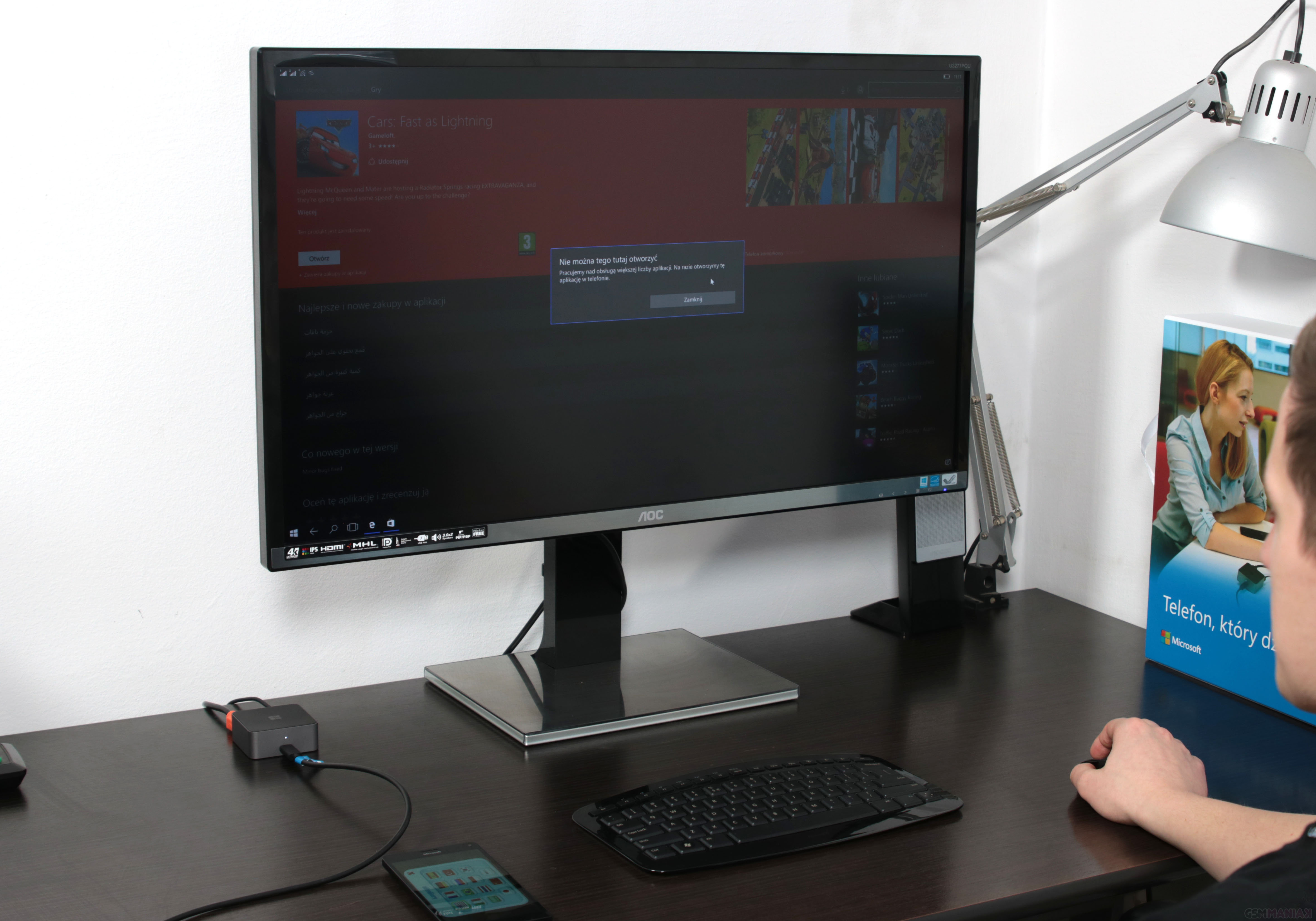 Aby uruchomić funkcję Continuum trzeba podpiąć do monitora lub telewizora, za pomocą kabla HDMI wspomnianą stację dokującą i podłączyć ją do prądu. Tak naprawdę tylko tyle powinno wystarczyć, bo myszkę i klawiaturę może zastąpić nam wirtualny gładzik wyświetlany na ekranie telefonu. Jeśli jednak mamy te akcesoria podpinamy je również do stacji dokującej.
