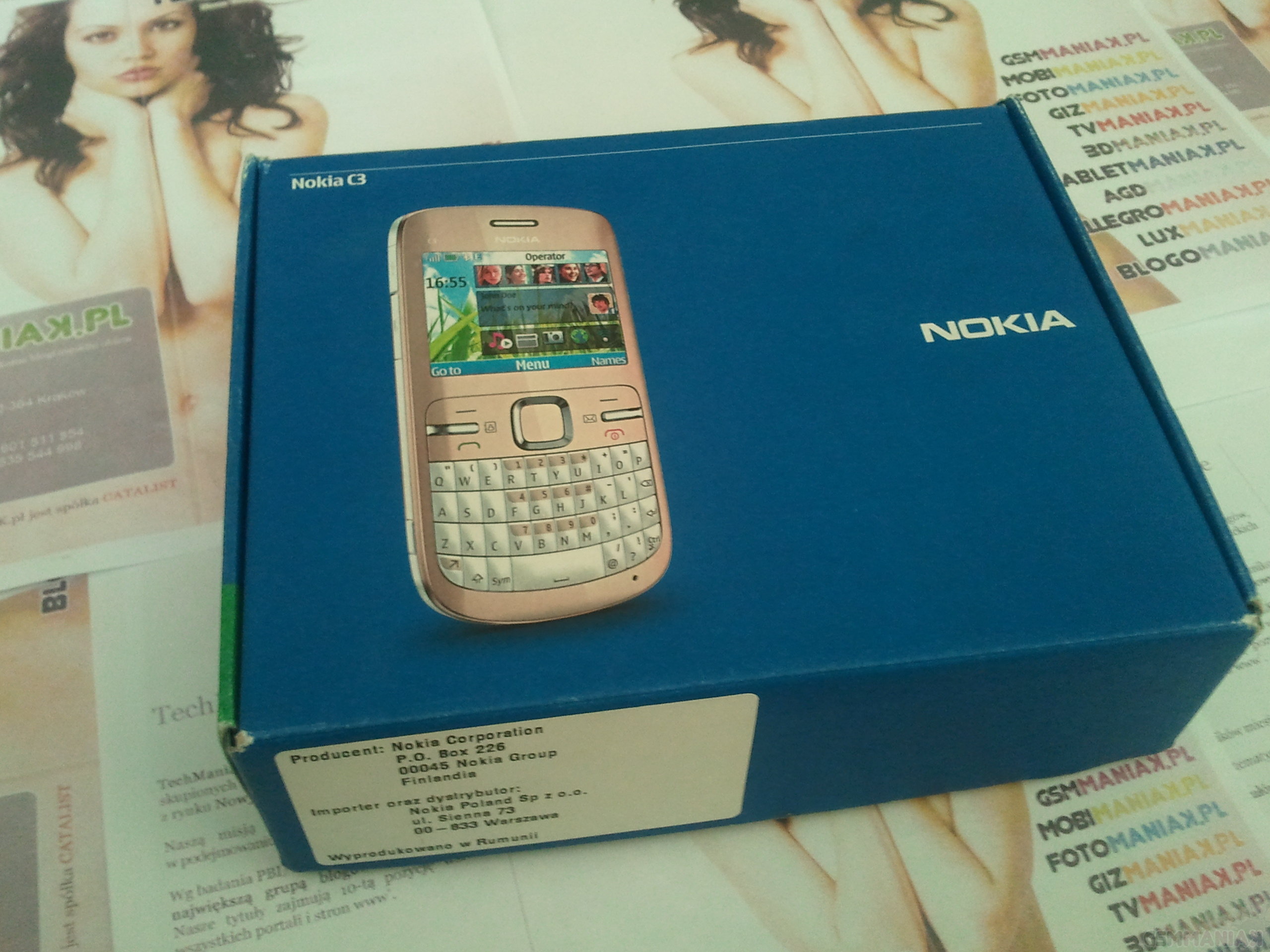 Pudełko, w jakim dotarła do mnie Nokia C3, to standardowe, ekologiczne opakowanie Nokii, które jest chyba identyczne dla wszystkich telefonów tego producenta. Moim zdaniem, taka konwencja, gdzie trzymamy się tylko jednego, jasno określonego wzorca, bez względu na to, czy jest to telefon dotykowy, z pełną klawiaturą QWERTY czy też jakikolwiek inny slider, wprowadza pewnego rodzaju monotematyczność i nudę. Pomijając już tę kwestię, pudełko jest po prostu zwyczajne, nie przykuwa uwagi ani w aspekcie użytych materiałów – choć chwali się, że firma popiera działania ekologiczne – ani w kwestii rozmiarów opakowania.