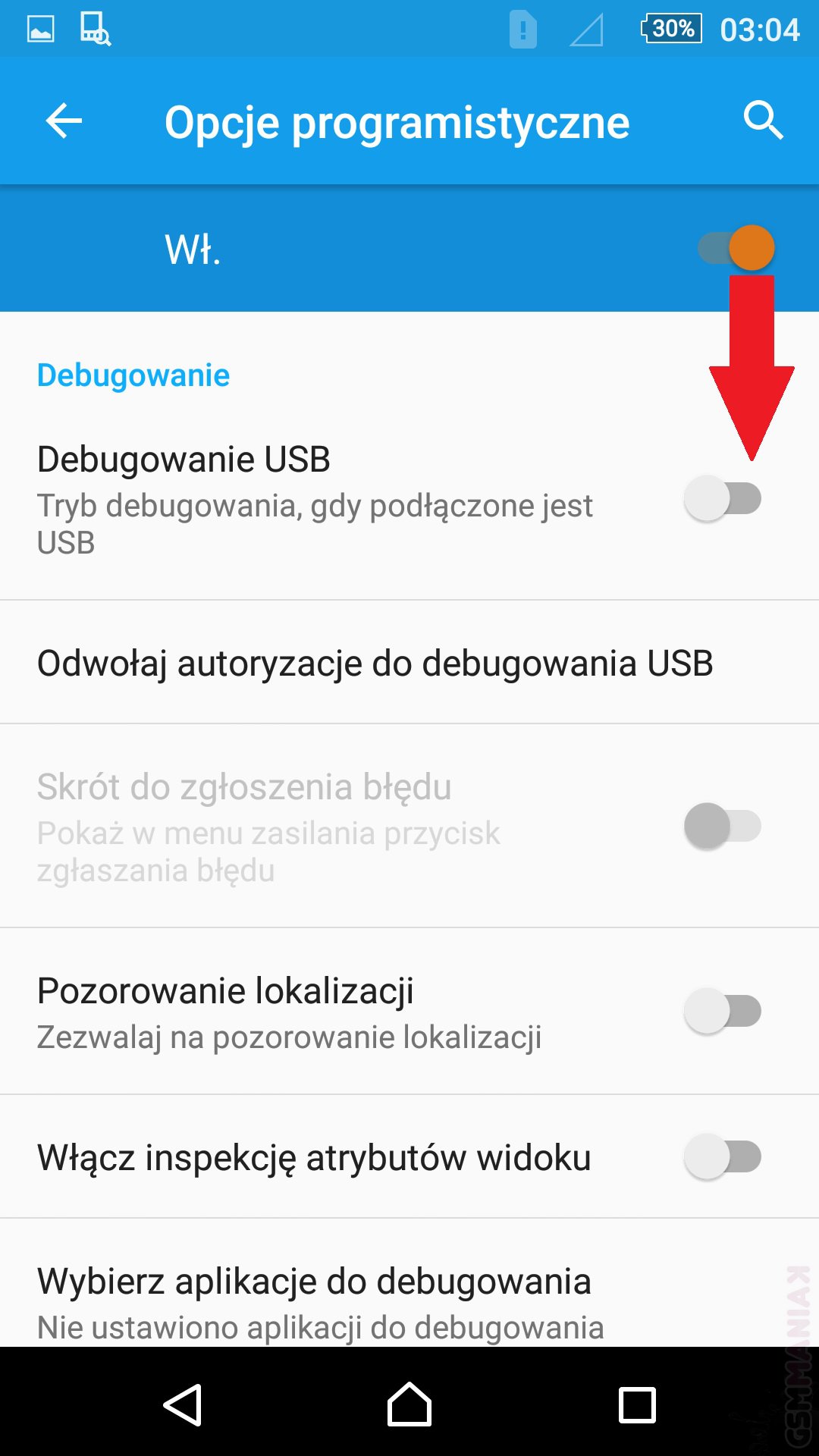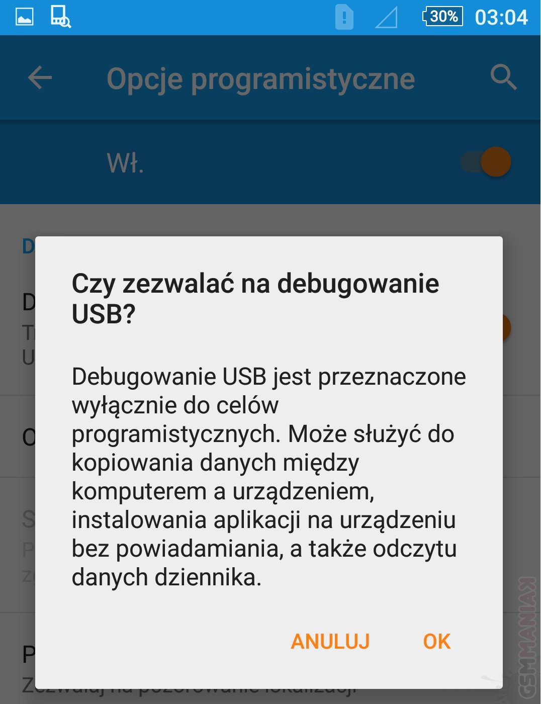 Następnie powinniśmy cofnąć się do ustawień gdzie zobaczymy pole „opcje programistyczne”, czyli zakładka, która dotychczas nie była dostępna dla użytkownika. Jestem przekonany, że Wasza ciekawość nie pozwoli długo czekać i sami wejdziecie w to magiczne pole. W nowo odkrytej zakładce mamy wiele ciekawych możliwości, nas jednak interesuje tryb debugowania USB, który odnajdujemy na liście. Po włączeniu trybu i połączeniu telefonu z naszym komputerem domowym urządzenia zapamiętają swoje klucze RSA i smartfon przy każdej następnej próbie połączenia nie będzie pytał o potwierdzenia, oraz rodzaj połączenia.