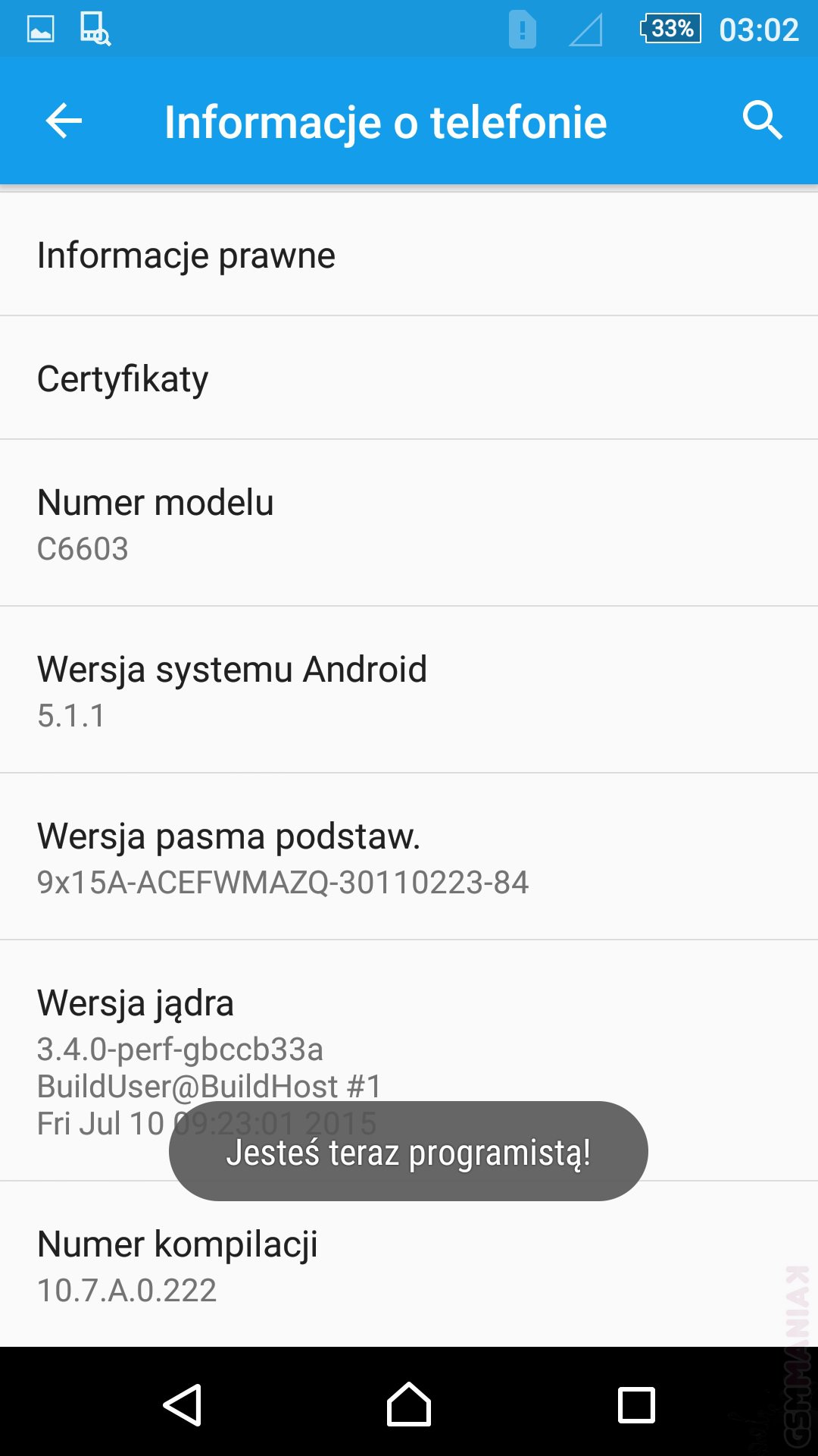 Proces włączania tego trybu jest bardzo prosty, jednak najpierw należy sprawdzić jaką wersję androida posiadamy. Dla urządzeń z Androidem w wersji 4.2, 4.3 lub wyższej dostępna wcześniej w ustawieniach zakładka “opcje programisty” została ukryta, co nie oznacza, że jej tam nie ma. W starszych wersjach taka zakładka jest dostępna w ustawieniach na samym dole bez żadnych dodatkowych operacji aby ją odnaleźć. Z racji, że mamy już androida Marshmalow (za pasem wersja N) zaprezentuje jak znaleźć i włączyć wspomnianą wyżej zakładkę na androidzie lollipop 5.1.1 modelu Sony Xperia Z. Po wejściu w ustawienia szukamy zakładki – Informacje o urządzeniu (na samym dole) klikając w nią, następnie szukamy pozycji – Numer kompilacji i klikamy w to pole aż 7 razy do momentu wyświetlenia się hasła – Jesteś już programistą.