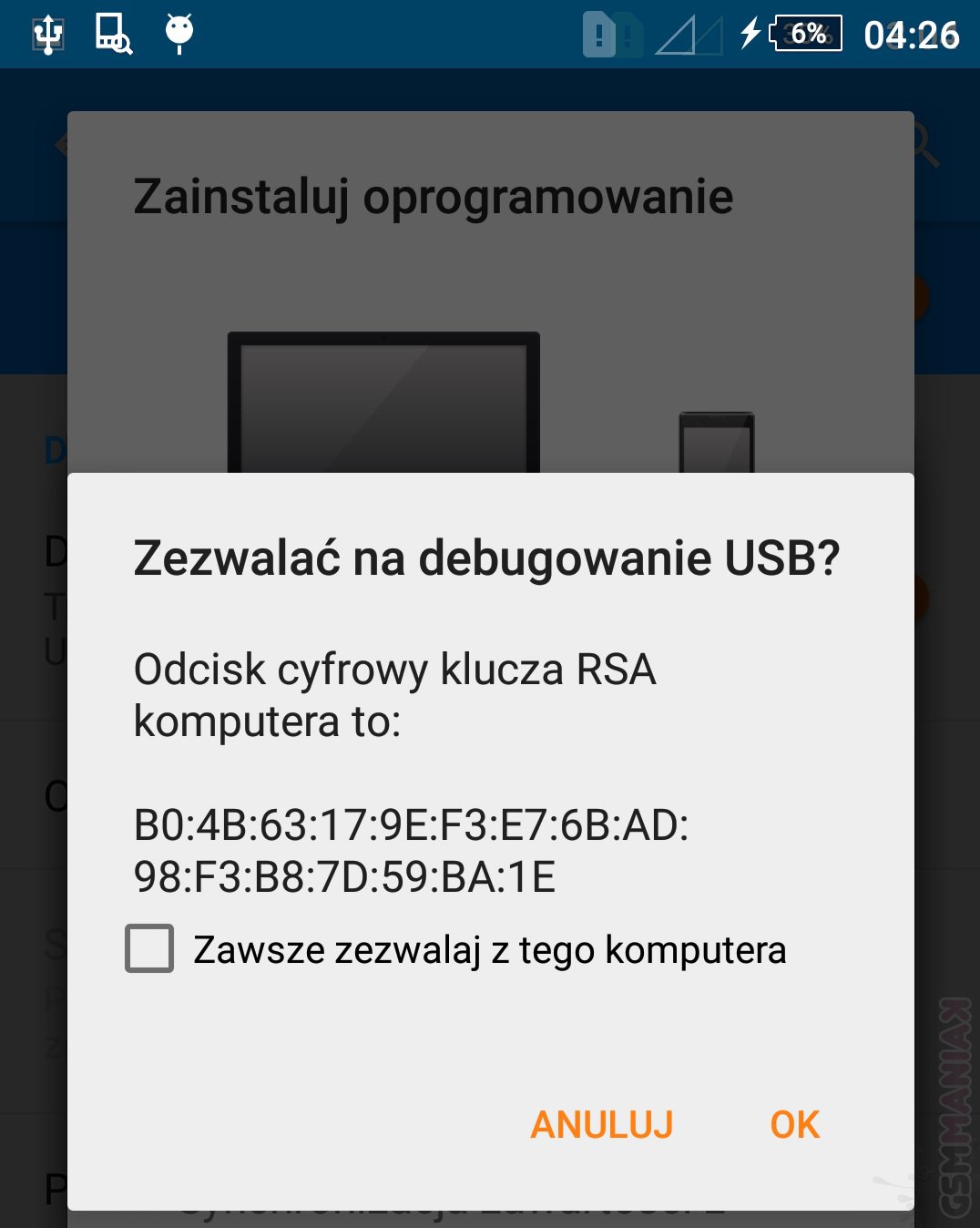 Dla czytelników, którzy nie wiedzą co kryje się pod tym zagadnieniem już spieszę z wyjaśnieniem. Otóż debugowanie USB dla telefonu Android to metoda na ochronę naszych danych i aplikacji poprzez połączenie smartfona z komputerem za pomocą kabla USB, co też wyjaśnia nam poniższy screenshoot. Android w miarę rozwoju, oraz nowych aktualizacji cały czas pracuje nad poprawkami tak, aby wszystko działało prawidłowo. Debugowanie pozwala nam na dostęp za pomocą kabla USB do naszych wewnętrznych danych bez potrzeby potwierdzania w smartfonie połączenia.