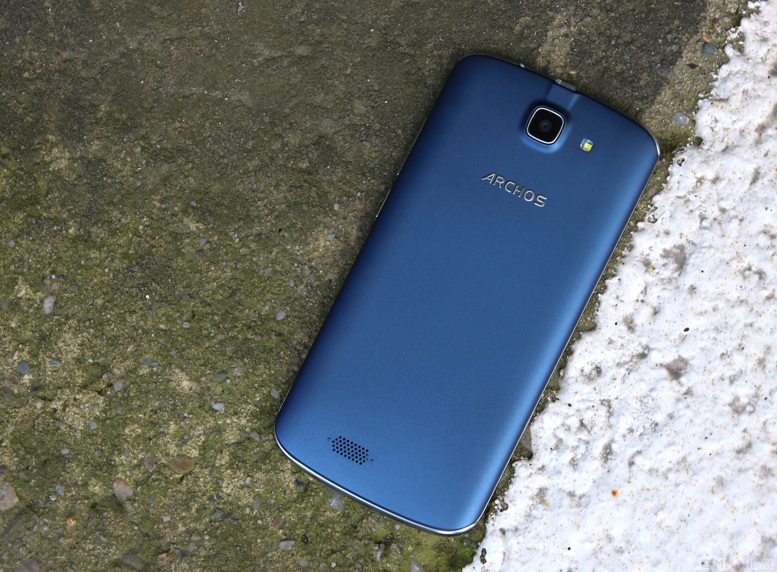 Jak na urządzenie kosztujące około 400 zł, Archos prezentuje się bardzo urodziwie. Z zewnątrz nie widać oszczędności. Na pierwszy rzut oka telefon wygląda jak sprzęt wyceniony na dwa lub trzy razy więcej. Obudowa ma zaokrąglone kształty i jest wykonana z plastiku, który z tyłu i na obramowaniach ma kolor niebieski. Krawędzie stanowi ładna, matowa, srebrna ramka imitująca metal. Całość wygląda estetycznie. W swojej kategorii cenowej to zdecydowanie jedno z ładniejszych urządzeń.