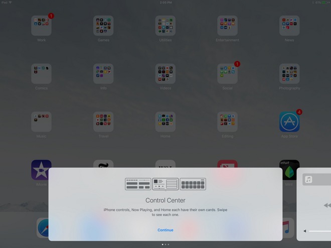 W iOS 10 beta 4, po pierwszym wysunięciu dolnego panelu pojawia się stosowna informacja z informacją o zmianach. Dostępne są trzy zakładki. Pierwsza zawiera opcje kontrolne urządzenia, druga przedstawia odtwarzacz, zaś trzecia została skierowana dla Home.