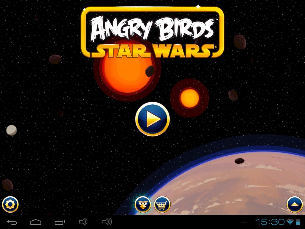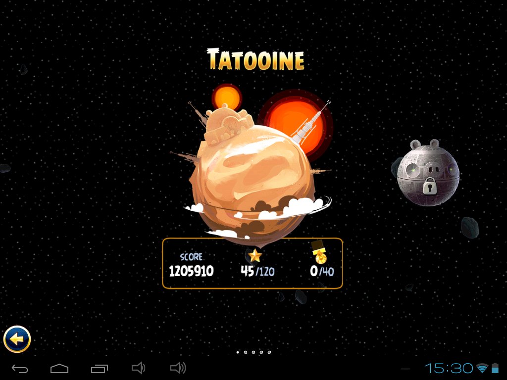 Akty zostały tu przedstawione jako konkretne planety – Tatooine, Gwiazda Śmierci (niby nie ciało niebieskie, ale służy do ich niszczenia), Hoth oraz Dagobah. Gra nie jest długa ani specjalnie trudna. Na pierwszą planetę przypada 40 plansz, z którymi poradzimy sobie bez większych problemów jeśli zależy nam tylko na dotarciu do końca. W razie ewentualnych trudności możemy, za zbierane podczas gry punkty, przyzwać nasz statek (osławiony Sokół Milenium), który potężnymi wiązkami laserów dokona masowej destrukcji. Trochę inaczej sprawa wygląda, jeśli próbujemy zdobywać złote gwiazdki i złote jajka. Nasze starania zostaną jednak wynagrodzone bonusowymi poziomami.