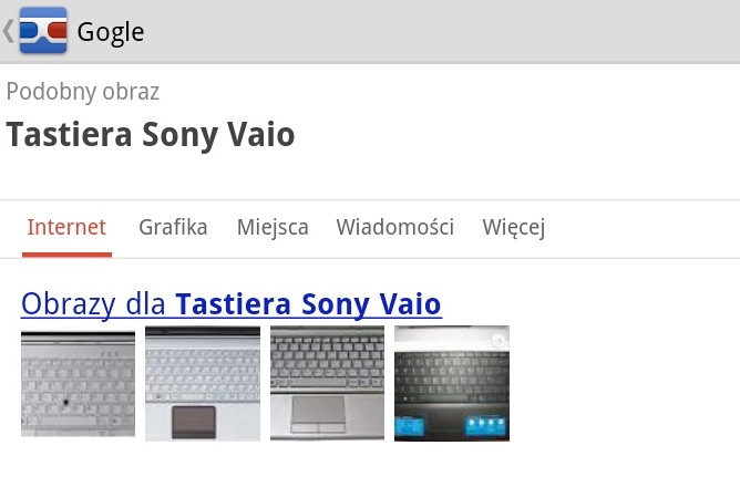 Szokujący wynik, bowiem fotografując sprzęt firmy X, spodziewałbym się informacji z Google na jej temat, a nie danych o firmie Y. Najbardziej zbliżony wynik to „klawiatura Sony VAIO„.