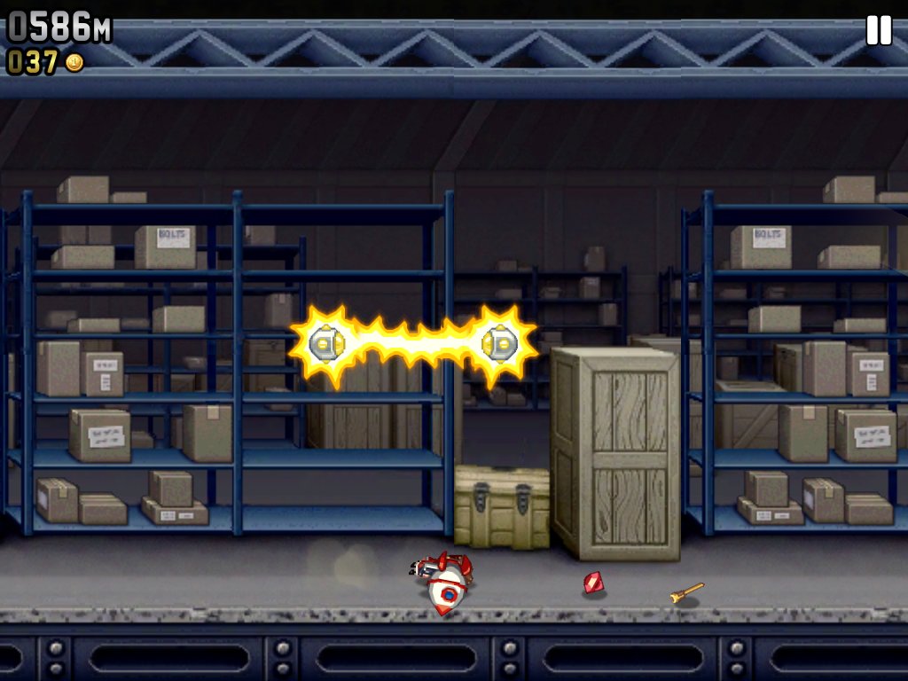 Oczywiście nie jest tak łatwo i bezproblemowo, jak mogłoby się wydawać. Każdy kolejny metr, który przemierzymy czy to przy pomocy plecaka odrzutowego, czy to własnych stóp staje się obładowany większą ilością czyhających na nasze potknięcie pułapek. Generalnie mamy do czynienie z cyklicznie pojawiającymi się laserami, chyżo lecącymi rakietami i czymś w rodzaju przewodów elektrycznych – kontakt z czymkolwiek kończy się natychmiastowym zgonem naszego protagonisty. Panowie ze studia Halfbrick zaimplementowali w grze również wiele ciekawych bajerów, które znacząco zwiększają przyjemność płynącą z rozgrywki, dodatkowo wzbudzając w graczu chęć poprawy dotychczasowych osiągnięć. Wszystko to za sprawą systemu zadań dostępnych dla gracza.