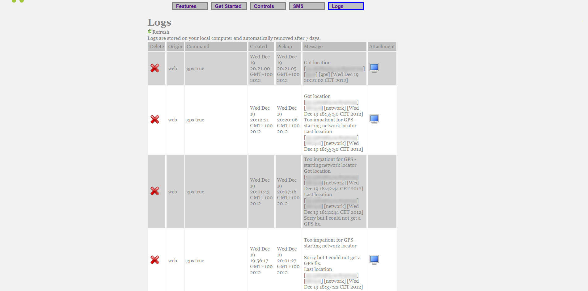 Po wysłaniu polecenia na telefon, odpowiedź znajdziemy w logach pod ikonką w kolumnie Attachment: