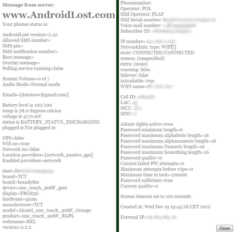 Próbuję więc dalej z „androidlost alarm 5” – zadziałało jak powinno; „androidlost gps” mielił, mielił i po 3 minutach podał pozycję z dokładnością – jak uznał – do 50m.