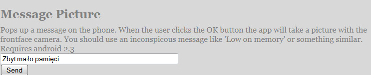 Podobnie jak w Message Pictures tutaj mamy możliwość zdalnego robienia zdjęć. Już bez wyświetlania komunikatu, przez co – niestety – nie zarejestrujemy żadnej podejrzanej twarzy, a jedynie to, co znajduje się przed obiektywem aparatu z przodu (Front) czy z tyłu (Rear). Obsługa jest banalnie prosta, wystarczy wcisnąć przycisk „Take picture”. W przypadku smartfonów nie wyposażonych w aparat do wideorozmów, zdjęcie zostanie zrobione aparatem z tyłu obudowy (tutaj wystarczy Android 2.2)