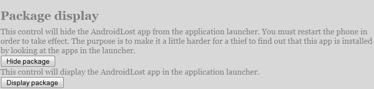 Nadszedł czas na element tej całej układanki, który powinien być uwzględniony na samym początku. Pora ukryć naszą „szpiegowską aplikację” przez przenikliwym wzrokiem wstrętnego złolazcy. Cała operacja – zresztą jak większość – ogranicza się do kliknięcia, w tym przypadku przycisku „Hide pacage”. Jeśli zechcemy przywrócić poprzedni stan wystarczy – „Display pacage”. Każda zmiana wymaga ponownego uruchomienia telefonu.
