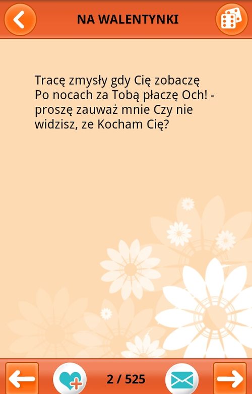 Życzenia Walentynkowe znajdziemy aż na 11-stu stronach, co jest bardzo dużą zaletą appki (co najmniej 525 gotowych tekstów w jednym programie). Wystarczy znaleźć ikonkę koperty (na dole strony) i wybrać sposób przesłania wiadomości ukochanej osobie (Bluetooth, E-mail, Gmail… albo najprościej w formie SMS).