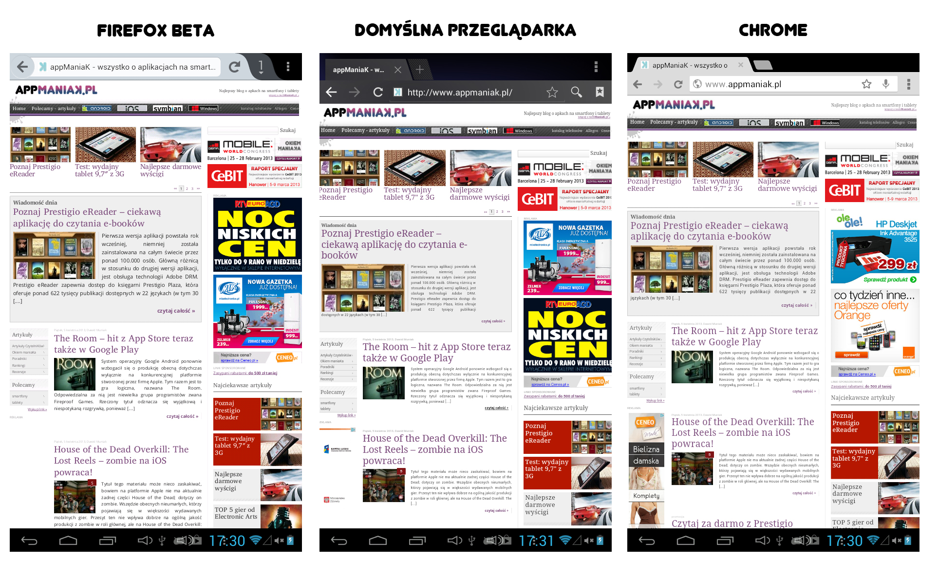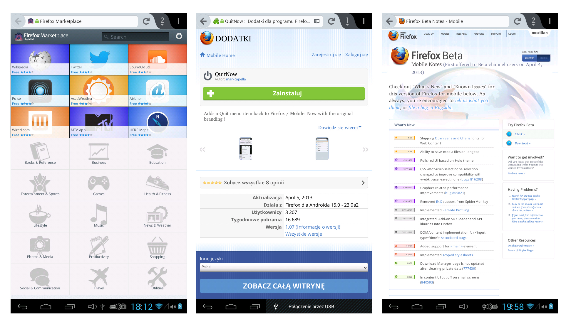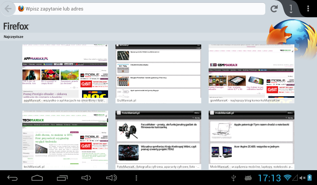 Użytkownicy tabletów i telefonów z Androidem najczęściej sięgają po jedną z dwóch przeglądarek internetowych – aplikację domyślnie instalowaną z systemem lub Chrome. Tymczasem w sieci nie brakuje alternatywnych rozwiązań – jednym z nich jest Firefox Beta, czyli pozostająca jeszcze w fazie testów, nowa edycja najpopularniejszego produktu Mozilli. Kilka dni temu (2 kwietnia 2013) światło dzienne ujrzały nowe bety Firefoksa na systemy Windows, Mac, Linux i Android. Tej ostatniej postanowiłem się bliżej przyjrzeć.