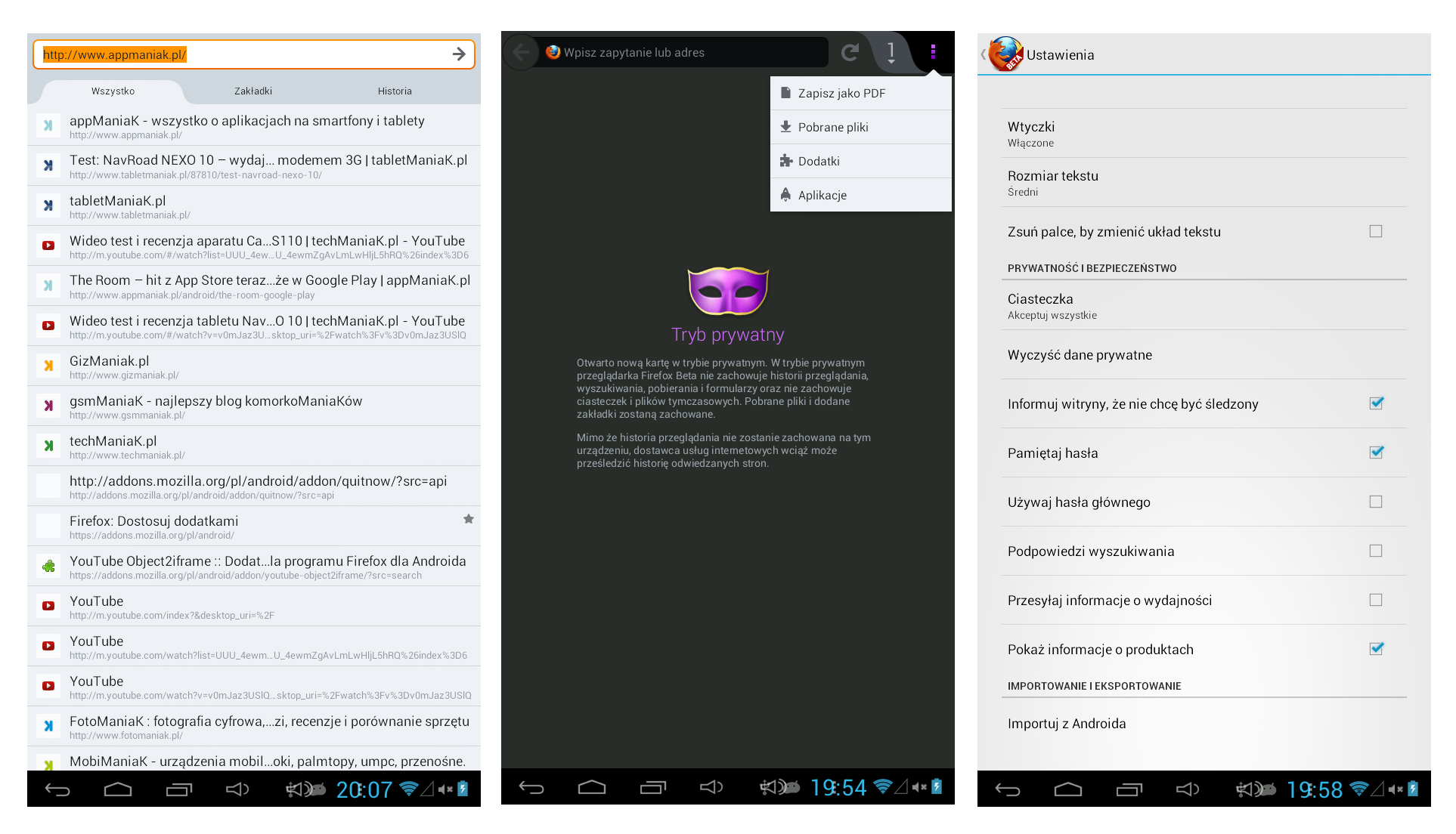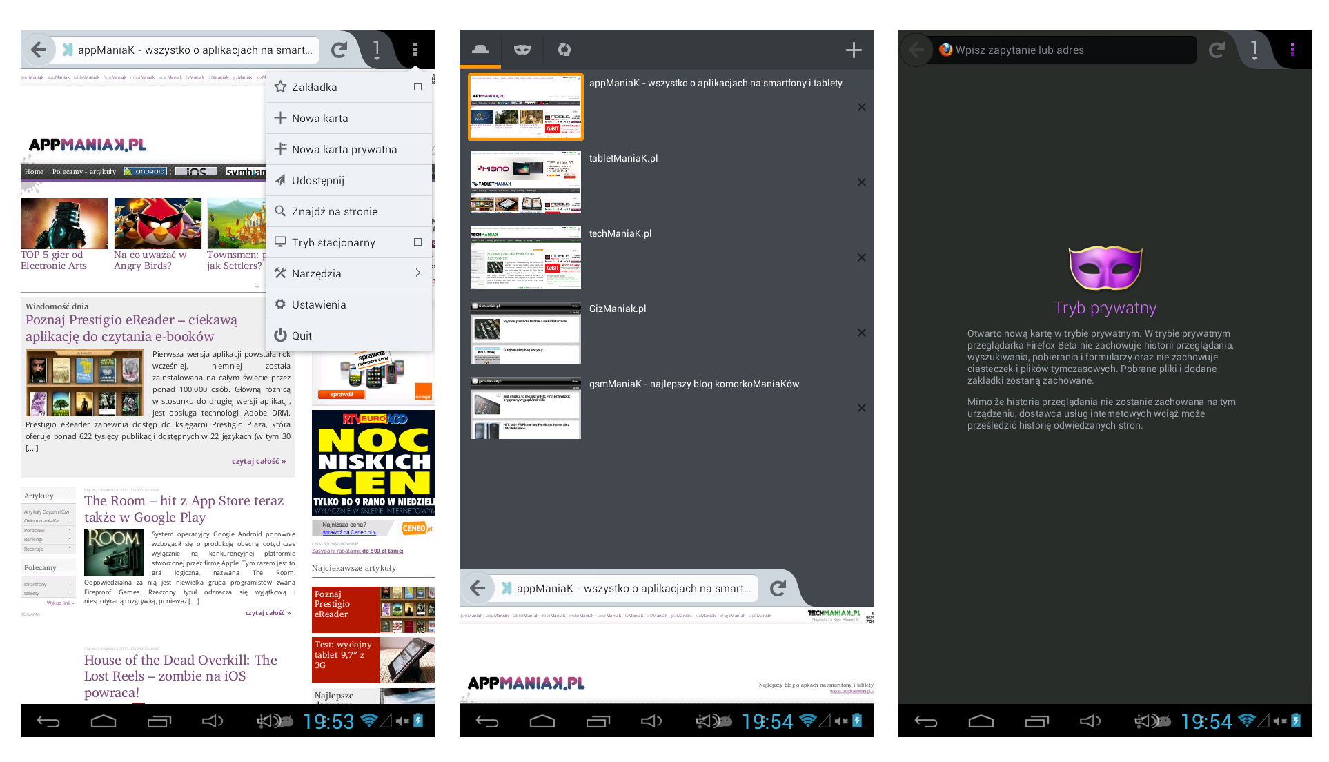 Przeglądarkę Firefox trzymam wśród swoich ulubionych desktopowych aplikacji od dawna, używając jej najczęściej zamiennie z popularnym Chrome. Dlatego też od samego początku uważnie śledziłem poczynania programistów Mozilli na polu mobilnym. Niestety, pierwsze efekty były bardzo dalekie od tego, co na tablecie lub telefonie chciałbym zobaczyć. To jednak historia – nowa beta wyraźnie pokazała, że mobilny Firefox przebył długą drogę, stając się w międzyczasie poważnym rywalem dla obecnych liderów w segmencie aplikacji na Androida.