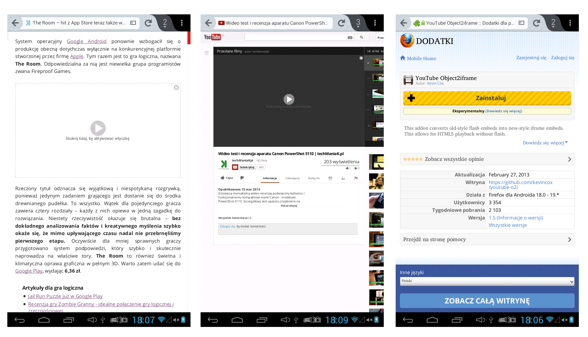 Mozilla konsekwentnie podąża swoją drogą i stara się promować autorskie pomysły i rozwiązania. Taki też (przynajmniej do pewnego stopnia) jest market aplikacji, czyli miejsce gdzie pobrać możemy mini-programy zwiększające funkcjonalność urządzenia. W moim wypadku ten element okazał się być zbędny, jako że większość dostępnych tytułów dubluje pozycje z Google Play. Dużo lepiej wypadają za to Dodatki, czyli pluginy rozszerzające podstawowy program o nowe funkcje. Już na start zaopatrzyłem się w dwa – QuitNow (robi dokładnie to, na co jego nazwa wskazuje – dodaje do menu przeglądarki opcję zakończenia sesji) oraz YouTube Object2iframe, który w teorii pozwala radzić sobie z problemami dotyczącymi wyświetlania osadzonych na stronach filmów.