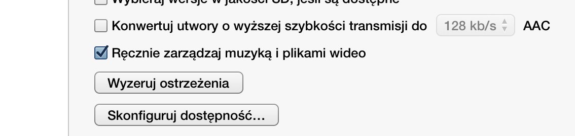 Aby móc przenosić muzykę do iUrządzenia nie wykonując synchronizacji czy nie tworząc list odtwarzania, należy podłączyć urządzenie do komputera, uruchomić iTunesa, kliknąć na podłączone urządzenie i wybrać opcję Ręcznie zarządzaj muzyką i plikami wideo.