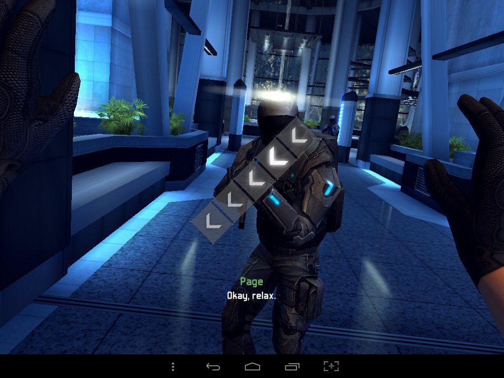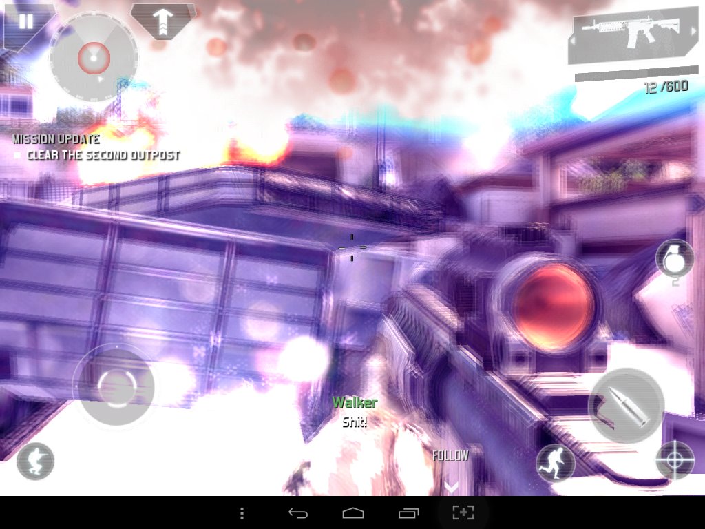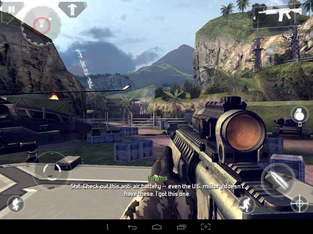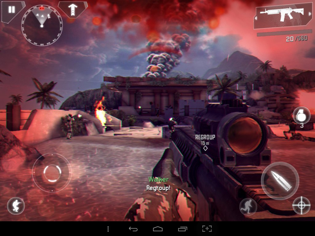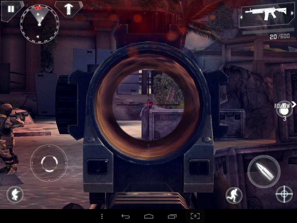 Sterowanie to klasyka tabletowego gatunku. Z lewej strony znajdziemy wirtualny dżojstik, kamerą obracamy przesuwając palcem po ekranie, z prawej strony są wszystkie przyciski akcji: strzał, celowanie, granat i sprint, z lewej umieszczono jeszcze możliwość zmiany pozycji na niską.