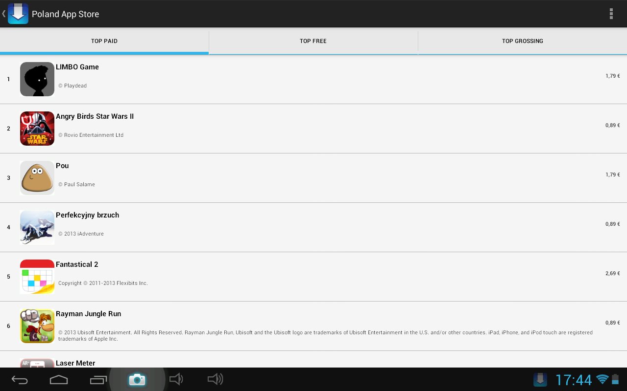 Rzeczony tytuł pozwala nam przeglądać najchętniej pobierane gry i aplikacje mobilne w sklepie App Store. Wybierając Polskę jako kraj zobaczymy spis trzystu produktów w trzech kategoriach: „Najlepsze płatne”; „Najlepsze bezpłatne”; „Najbardziej dochodowe”. Nie ma tu niestety podziału na gry i aplikacje, gdyż wszystko wrzucono do jednego „worka”. A szkoda. Po tapnięciu na interesujący nas tytuł przejdziemy do krótkiego opisu, identycznego jak ten zamieszczony w App Store. Co ciekawe, jeżeli mamy do czynienia z produkcją wieloplatformową, to nie ma najmniejszego problemu aby natychmiastowo przenieść się do sklepu Play – wystarczy jedno dotknięcie ekranu.