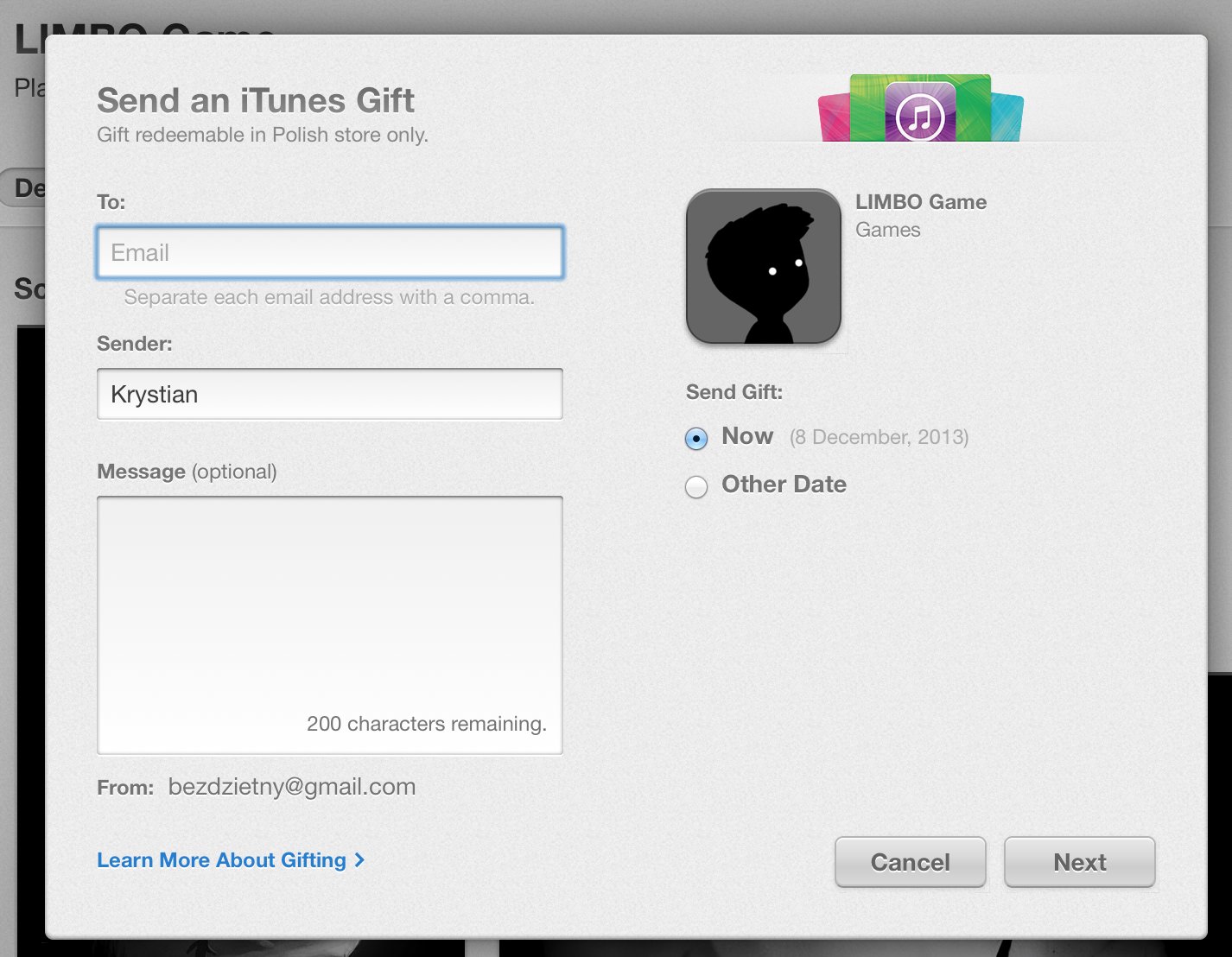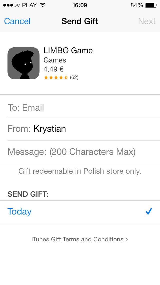 Uwaga! Korzystając z powyższych instrukcji należy pamiętać, że kod umożliwiający pobranie podarowanej aplikacji należy przesłać osobie, której Apple ID zostało zarejestrowane w tym samym kraju co nasze. Jeżeli więc korzystasz z polskiego oddziału App Store’a, to odbiorca twojego prezentu również musi mieć w nim założone konto.
